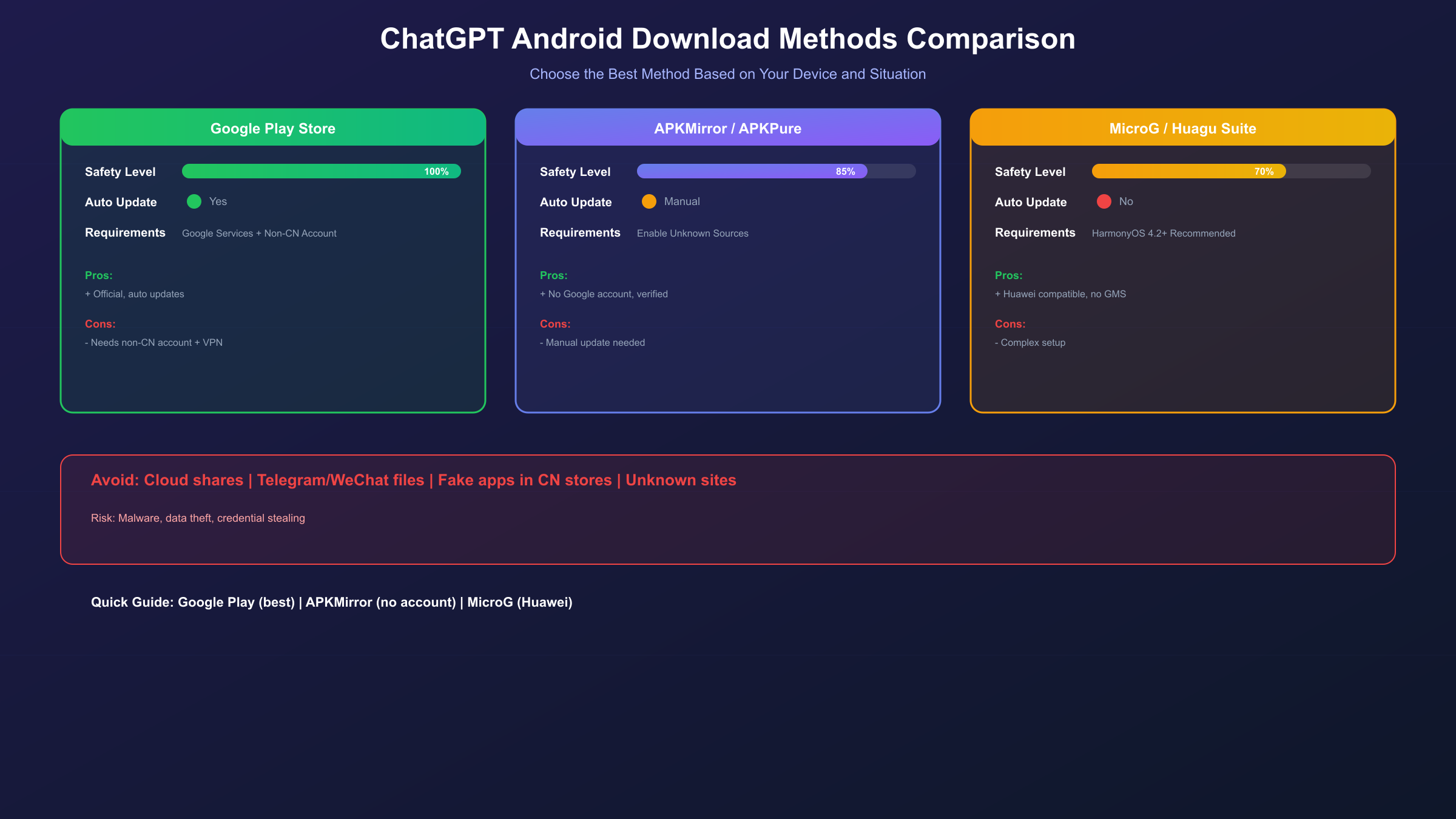 | 官方渠道 | Google Play | 最高 | 最快 | 有谷歌服务的设备 |