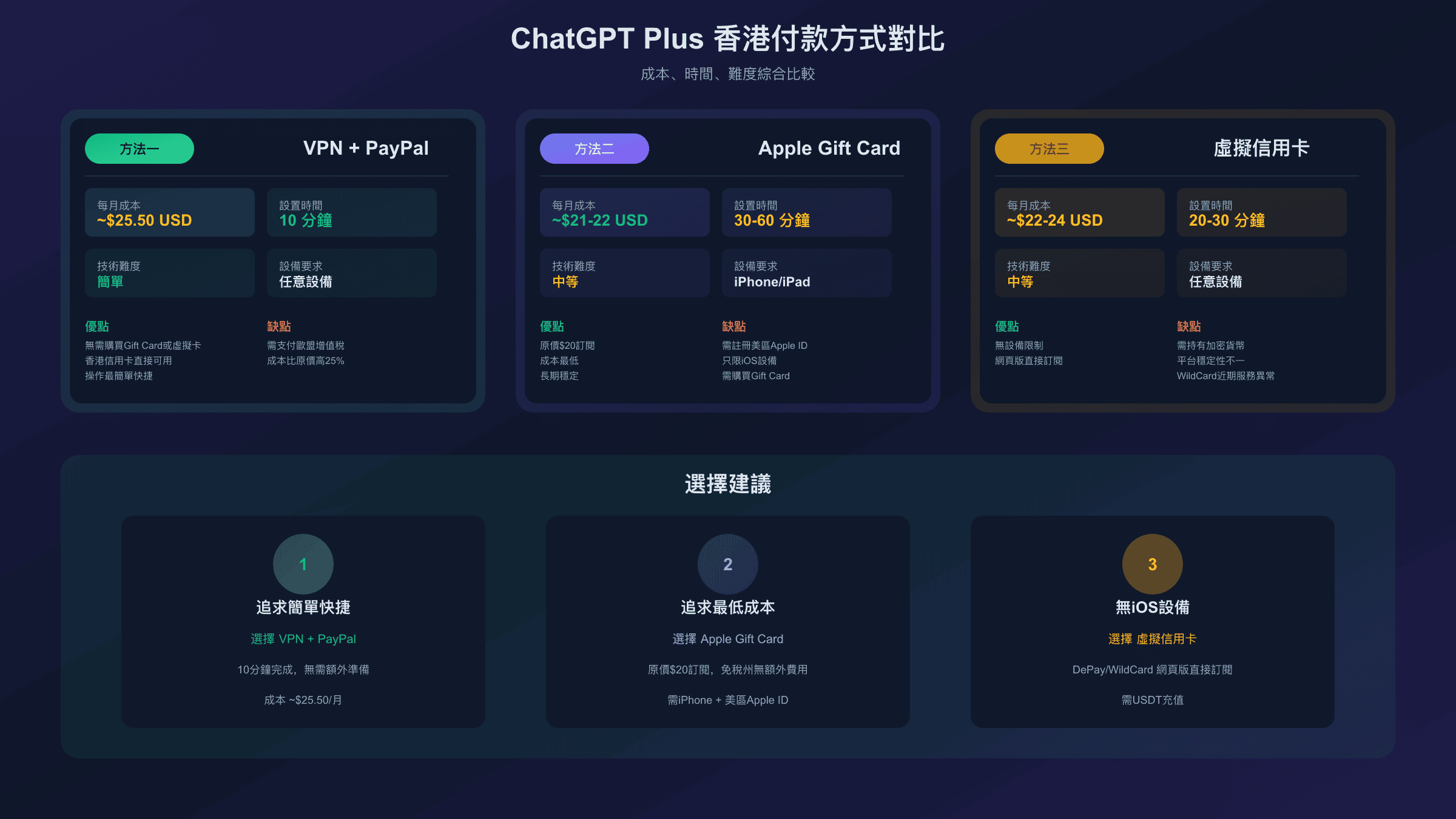 對於香港用戶來說,訂閱 ChatGPT Plus 雖然需要一些額外步驟,但並非難以實現。根據你的具體情況,這裡是最終推薦: