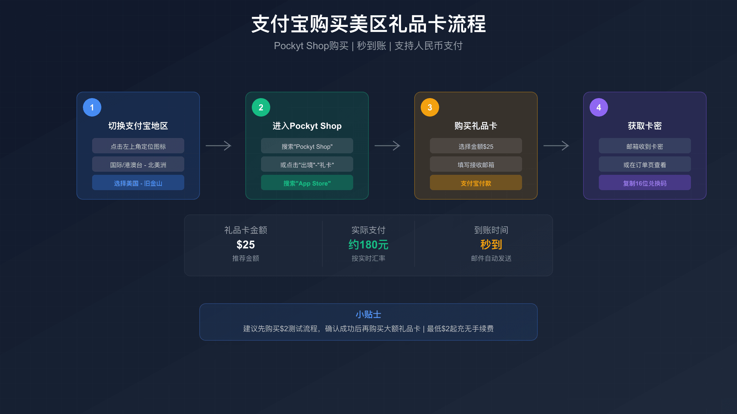 - 支付宝购买礼品卡:切换到美国地区,在Pockyt Shop购买美区礼品卡