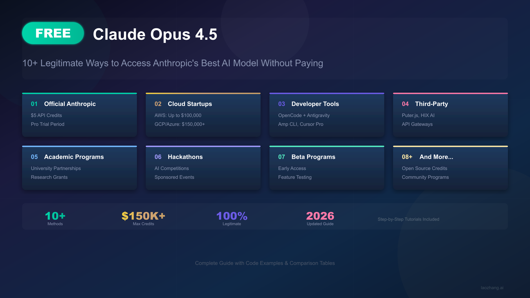 Complete guide to accessing Claude Opus 4.5 for free in 2026. Covers official credits, cloud startup programs worth $150K+, developer tools like OpenCode, third-party platforms, and academic programs. Includes step-by-step setup guides.