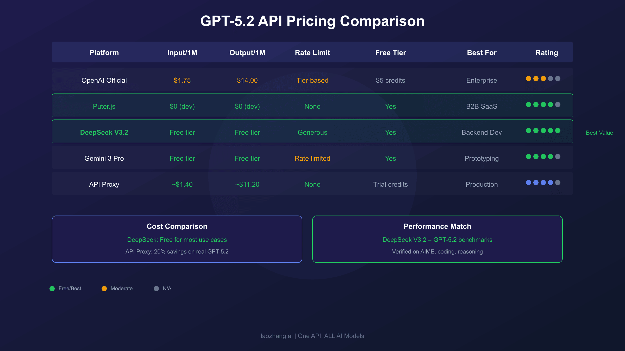 Looking for free GPT-5.2 API access without rate limits? This comprehensive guide covers official pricing, legitimate alternatives like Puter.js and DeepSeek, security risks of unofficial services, and practical code examples for developers.
