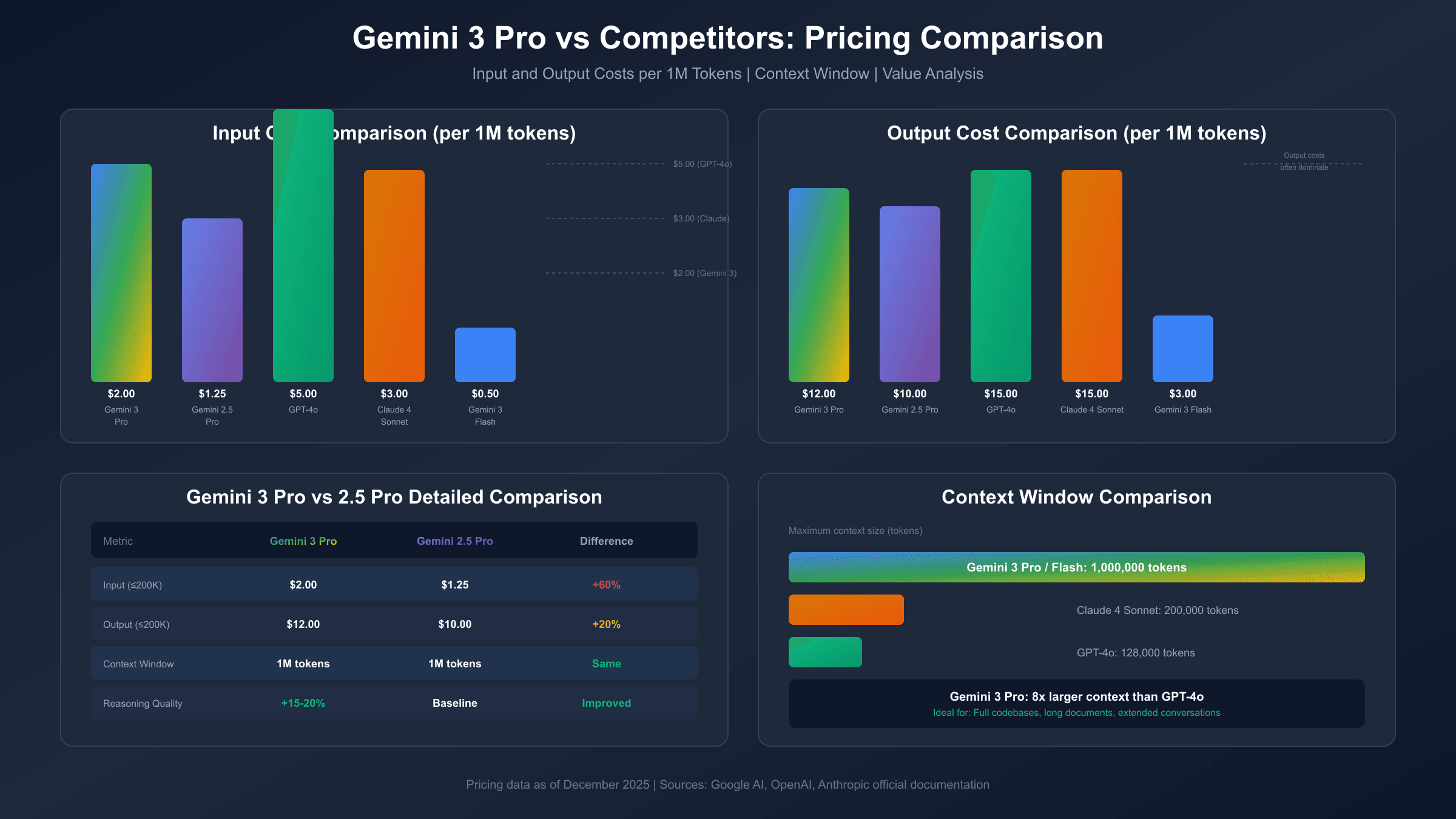 Whether you're evaluating Gemini 3 Pro for a new project, comparing it against GPT-4o or Claude, or trying to understand if the upgrade from Gemini 2.5 Pro makes financial sense, this guide provides the concrete data and analysis you need to make an informed decision. We'll cover exact per-token costs, realistic usage scenarios with calculated expenses, and insider tips for maximizing value from your API budget.