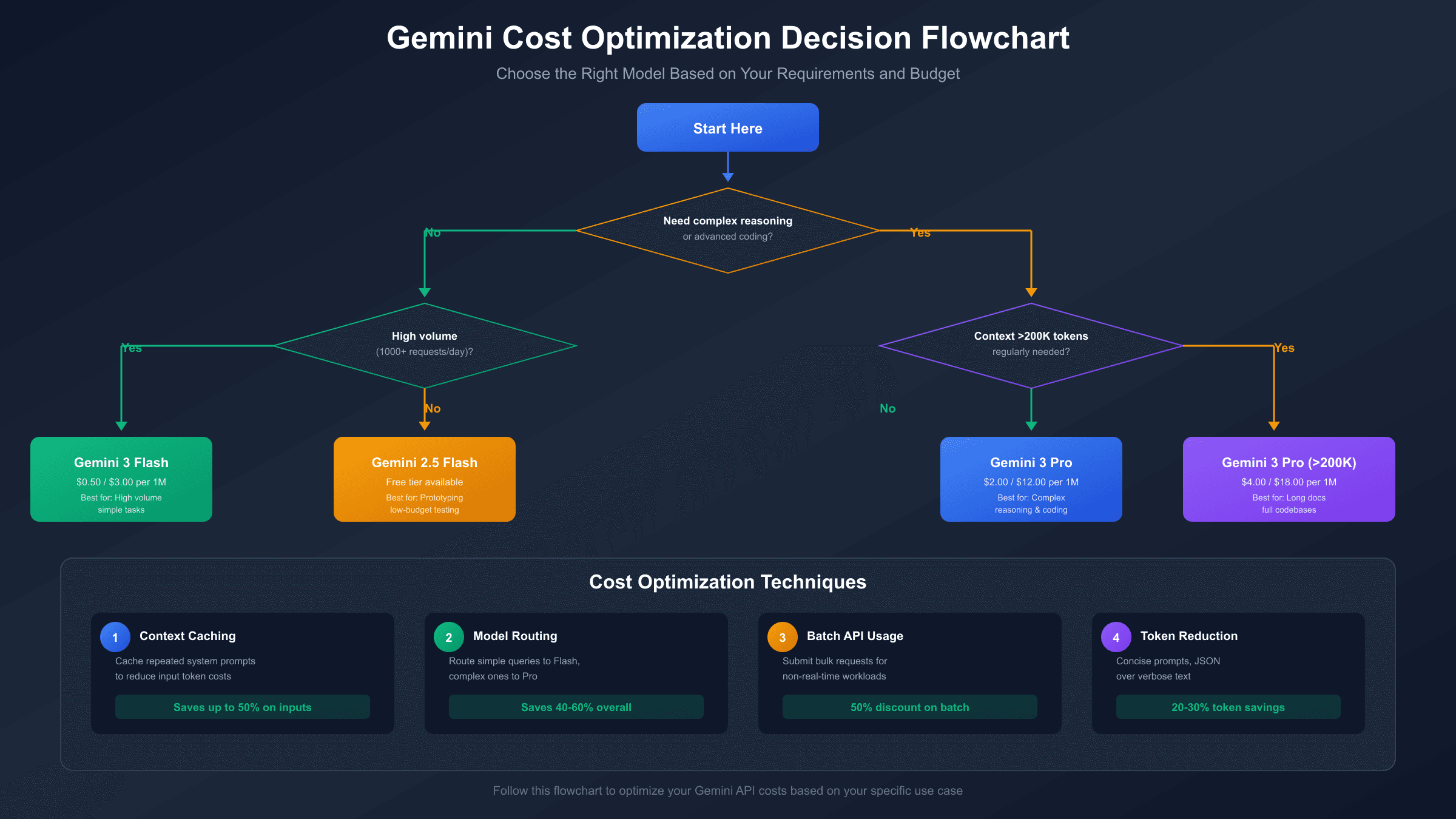 Model selection routing applies the right tool to each task. Build logic that routes simple queries to Flash while reserving Pro for complex reasoning. A classification layer (which can itself use Flash cheaply) can analyze incoming queries and direct them appropriately, ensuring you only pay Pro prices when Pro quality matters.