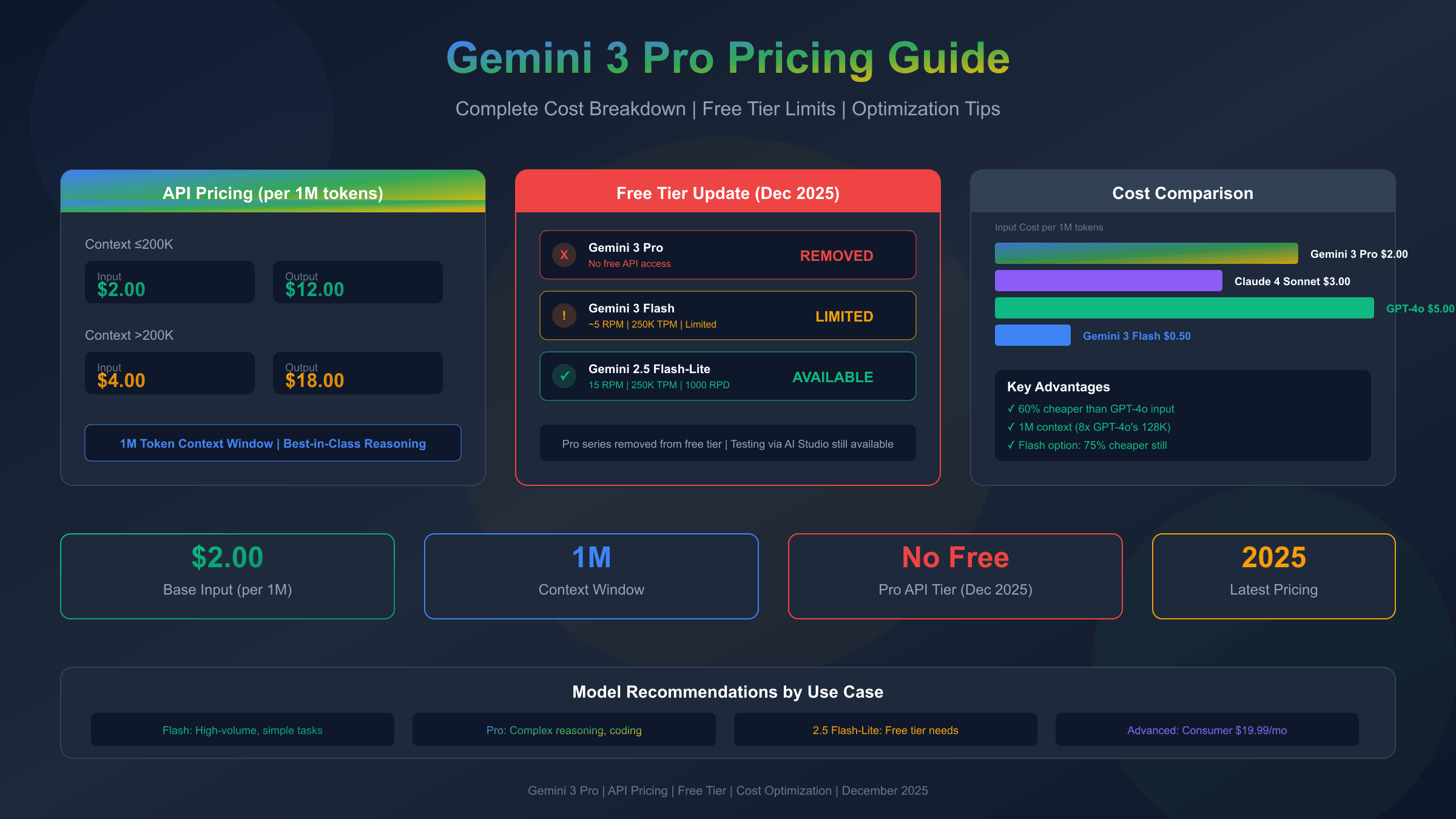 Gemini 3 Pro pricing starts at $2/1M input tokens. Learn about free tier limits (Dec 2025 changes), Flash vs Pro costs, and how to optimize your API spending.