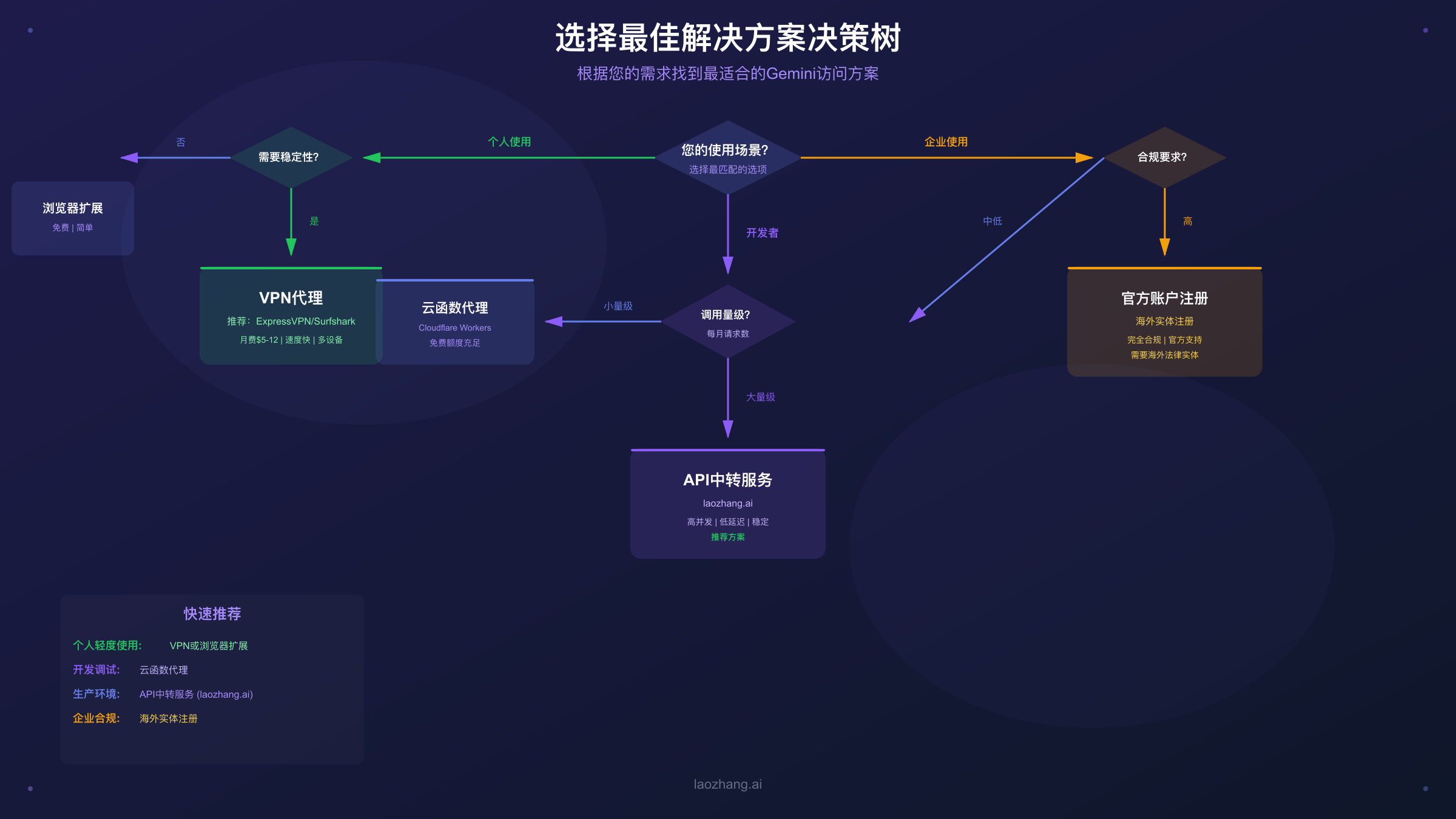 无论你是想临时体验Gemini的强大功能,还是需要将其集成到生产环境中长期使用,抑或是作为开发者需要稳定的API调用能力,本指南都能为你提供完整的解决路径。在开始之前,建议你先通过下面的速查表快速定位最适合自己的方案。