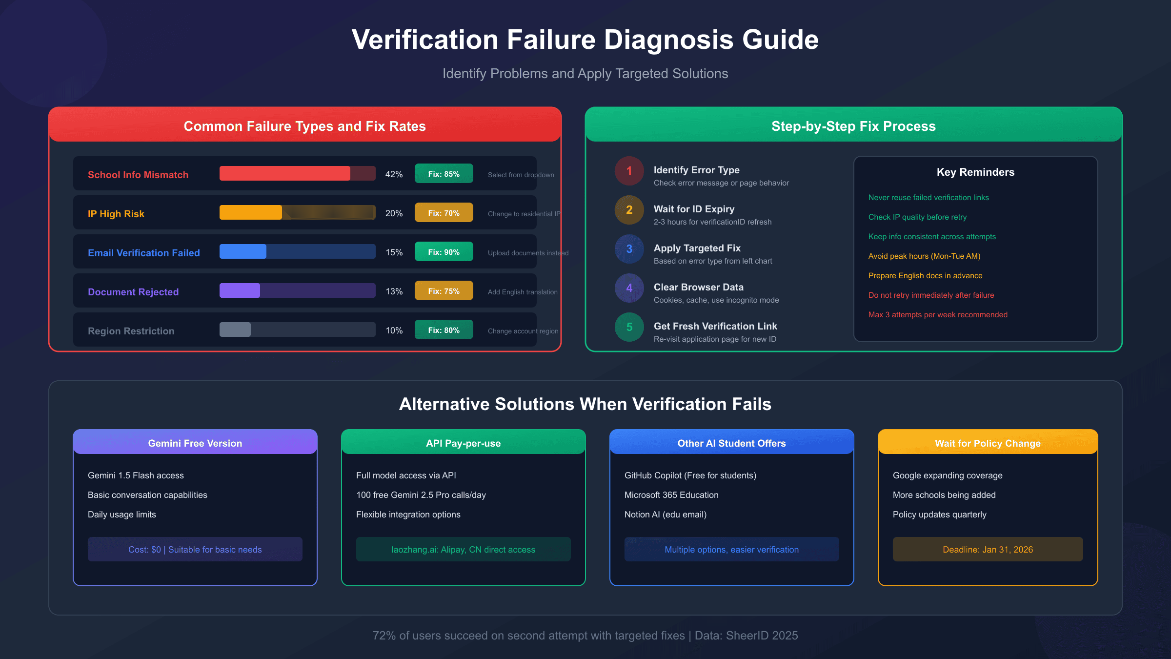 不建议立即重试。SheerID会记录失败的verificationID,使用相同链接重试通常会再次失败。正确做法是:等待2-3小时让系统更新;如果是IP问题,更换IP后清除浏览器缓存;重新访问申请页面获取新的认证链接再尝试。