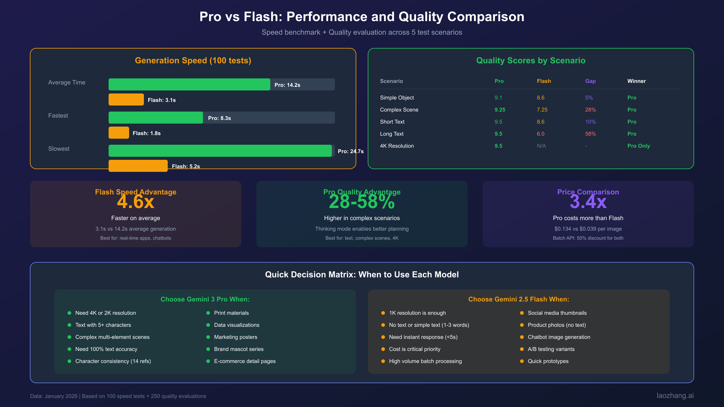 核心定位对比:Pro = 4K + 文字 + 思维模式($0.134/张);Flash = 速度 + 低价 + 免费配额($0.039/张)。两者是互补关系而非替代关系。