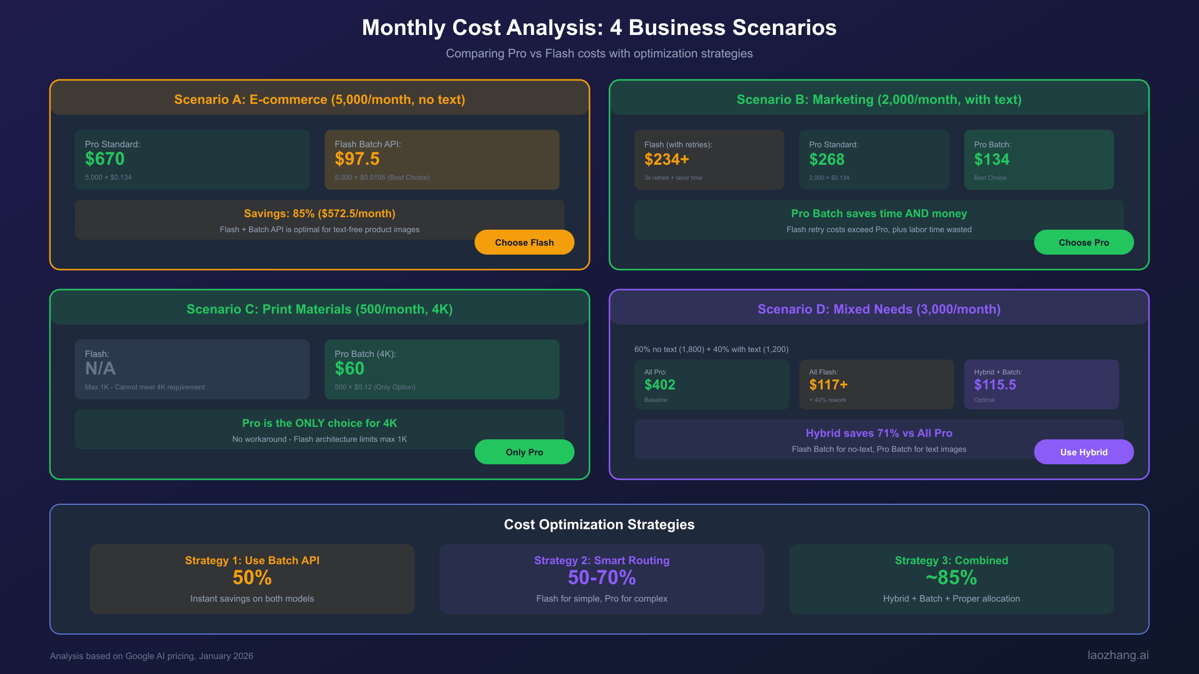 一句话选型原则:4K/2K/文字/复杂场景 → Pro;简单无文字/速度优先/成本敏感 → Flash。混合使用是最优解,可节省60-70%成本。