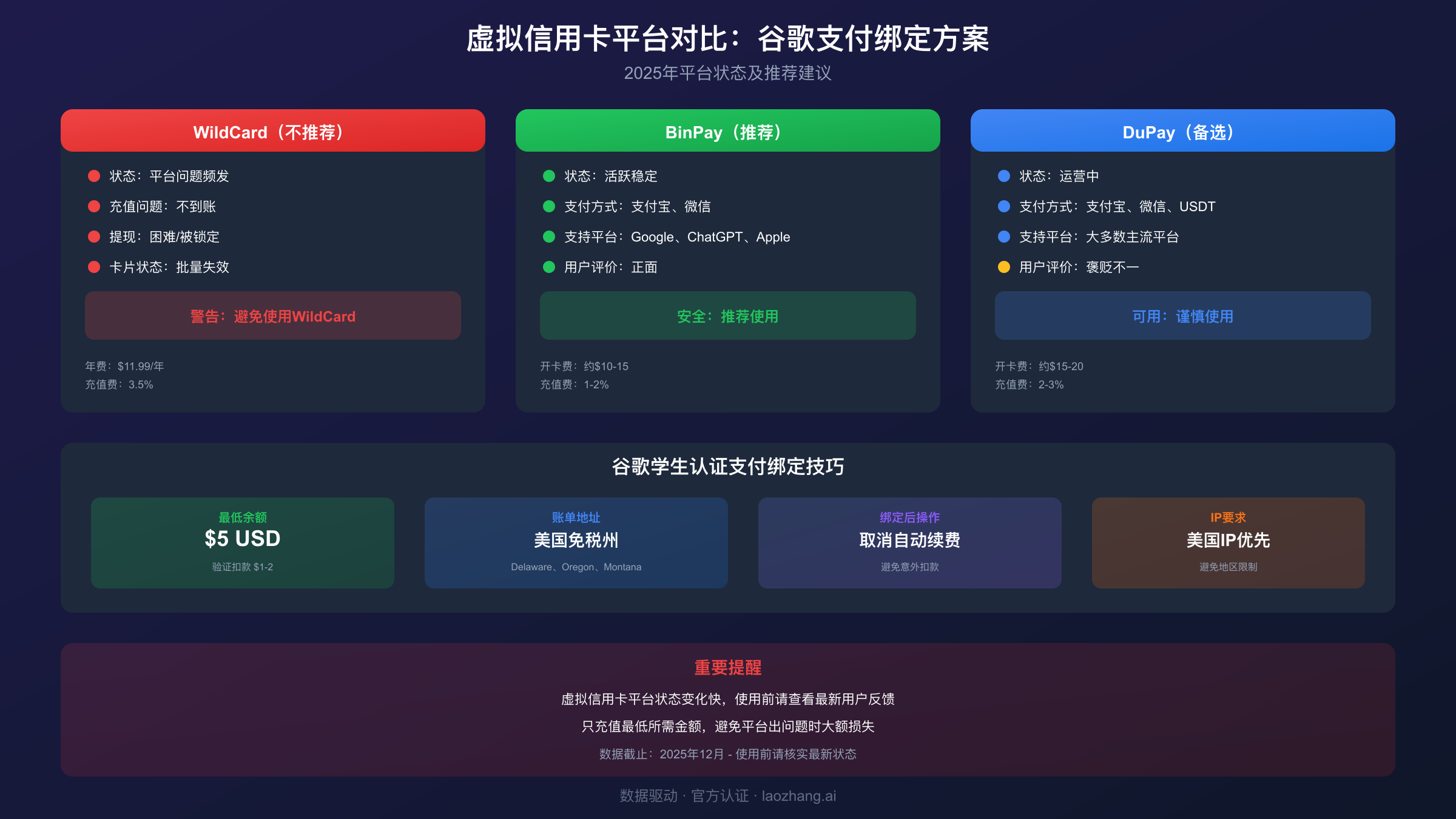 需要特别警告的是,2025年虚拟信用卡市场出现了较大变化。曾经广受推荐的WildCard(野卡)平台已出现严重问题,大批用户遭遇充值不到账、卡片失效、提现困难等情况。如果你之前使用WildCard,建议尽快转移余额或更换平台。