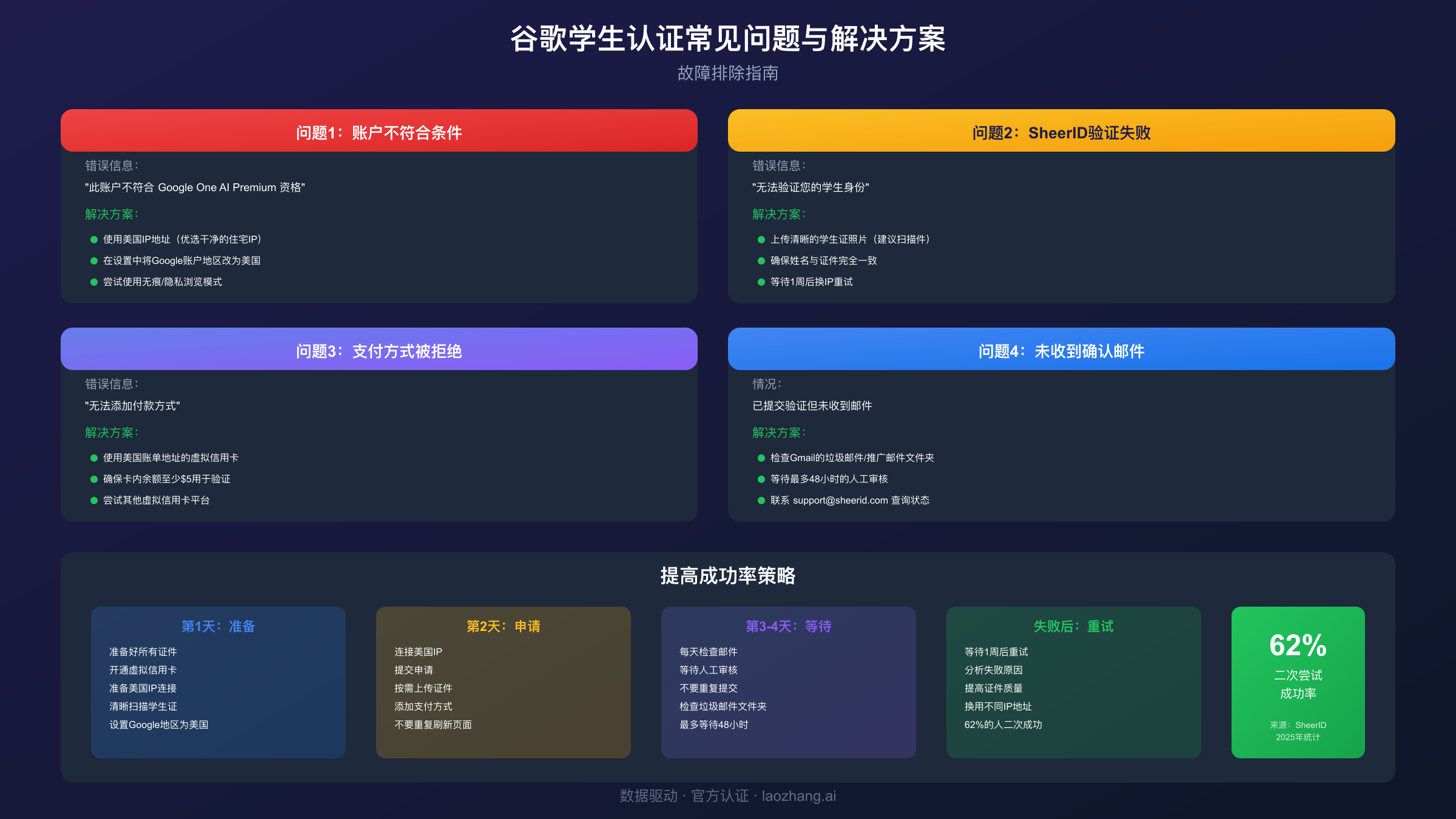 中国学生申请谷歌学生认证的成功率较低,主要原因有三:网络环境限制导致IP检测失败、学校邮箱不在SheerID数据库中、以及支付方式绑定困难。针对这些问题,以下是经过验证的解决方案。