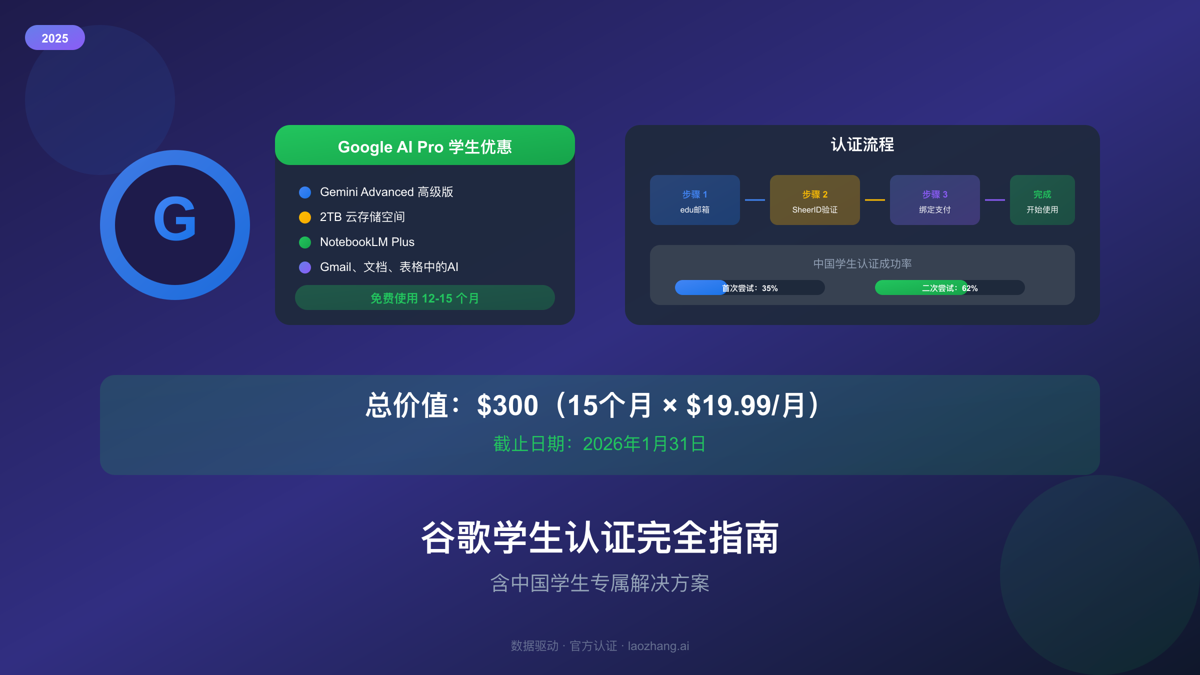 想免费使用价值300美元的Google AI Pro服务吗?谷歌推出的学生优惠计划让符合条件的大学生可以免费获得12-15个月的Gemini Advanced会员,包括最强AI模型、2TB云存储和NotebookLM Plus等高级功能。然而,对于中国学生来说,申请过程并不简单——SheerID验证、edu邮箱要求、国内银行卡无法绑定等问题困扰着许多人。本文将提供一份完整的申请攻略,从资格确认到认证通过,帮助你顺利拿下这份价值不菲的学生福利。