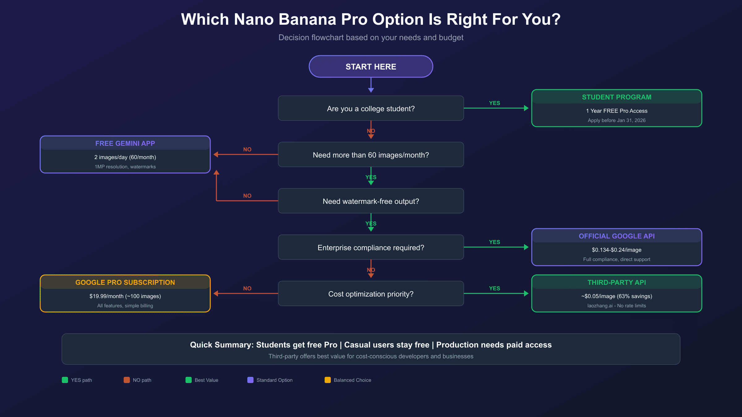 - Budget-conscious developers: Third-party services like laozhang.ai provide production-quality access at approximately 63% lower cost than official pricing