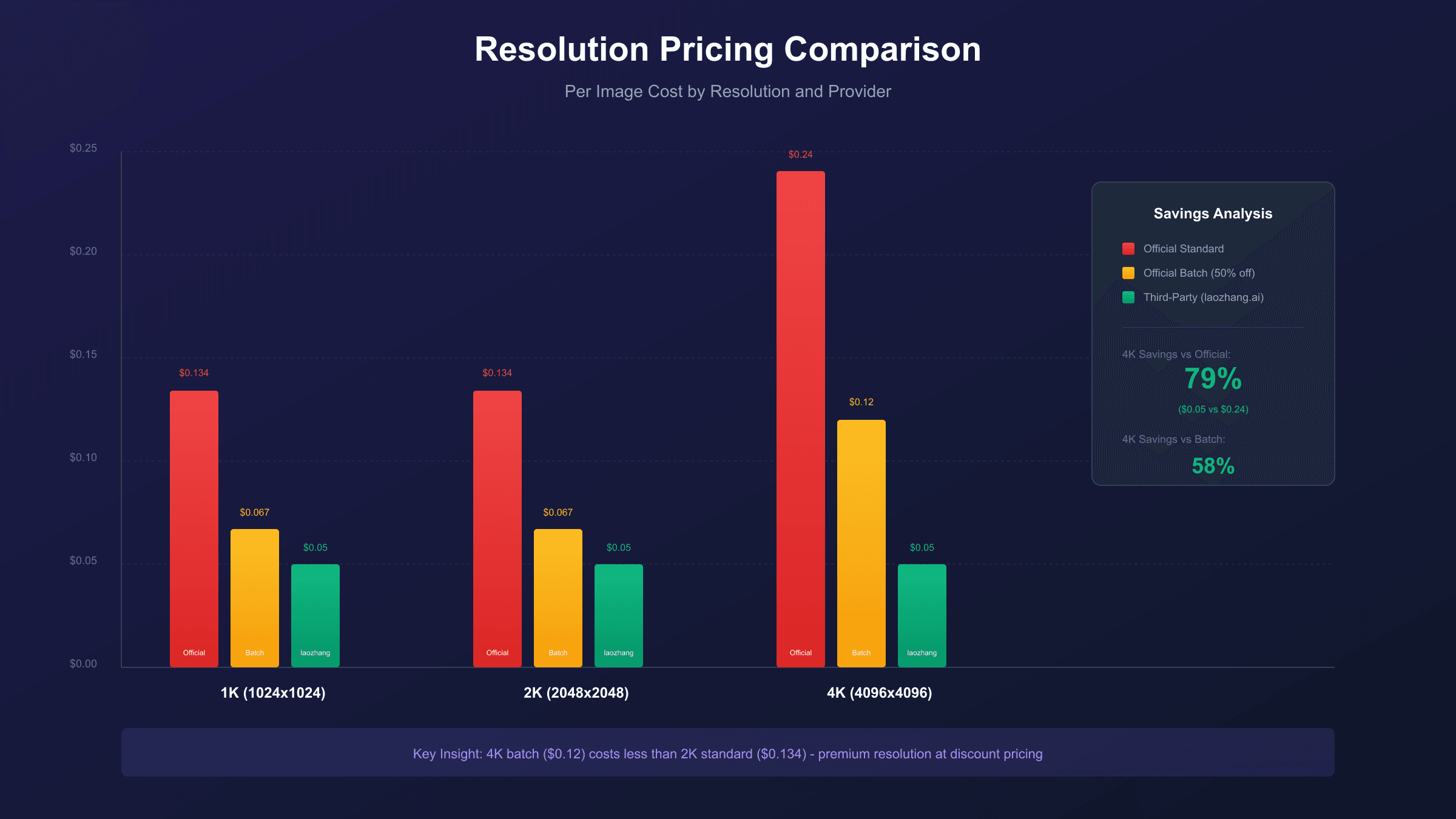 Nano Banana Pro API pricing follows a clear hierarchy: $0.134 per image for 1K/2K resolution, $0.24 per image for 4K, with 50% batch discounts for non-urgent workflows. Third-party alternatives like laozhang.ai offer the same model at $0.05 per image flat—delivering identical quality at 79% lower cost.