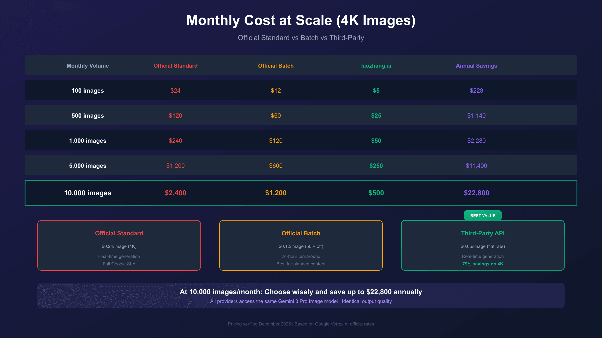 | Monthly Volume | Official Standard | Official Batch | laozhang.ai | Annual Savings (vs Official) |