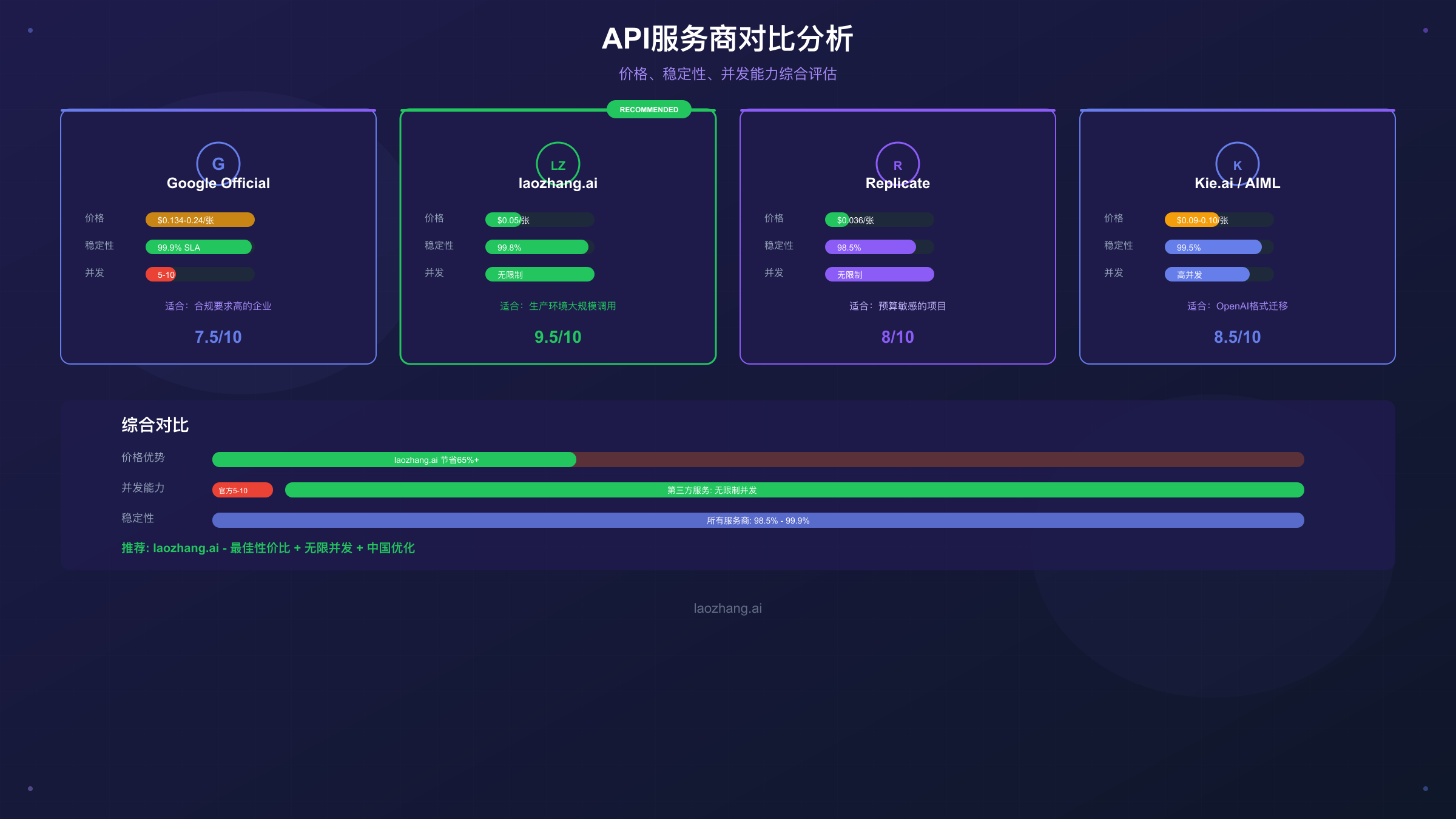 如果你是企业开发者,需要稳定的高并发能力,laozhang.ai 这类中转服务是最佳选择。它们提供不限速、高并发、低成本的服务,且接入成本极低。以laozhang.ai为例,$0.05/张的价格相比官方节省约65%,同时提供99.8%的可用性保障。详细价格可查阅官方文档。