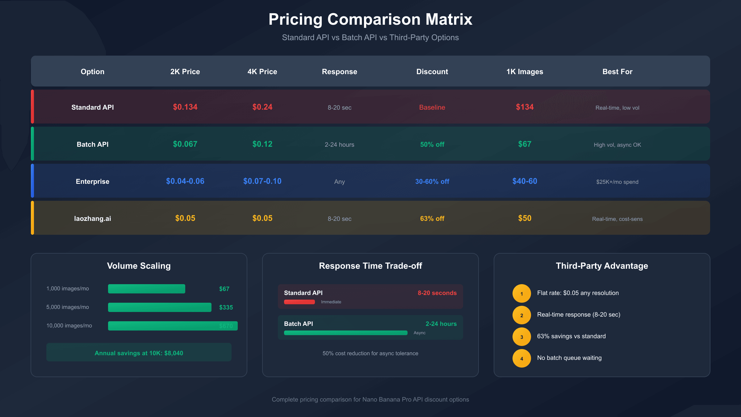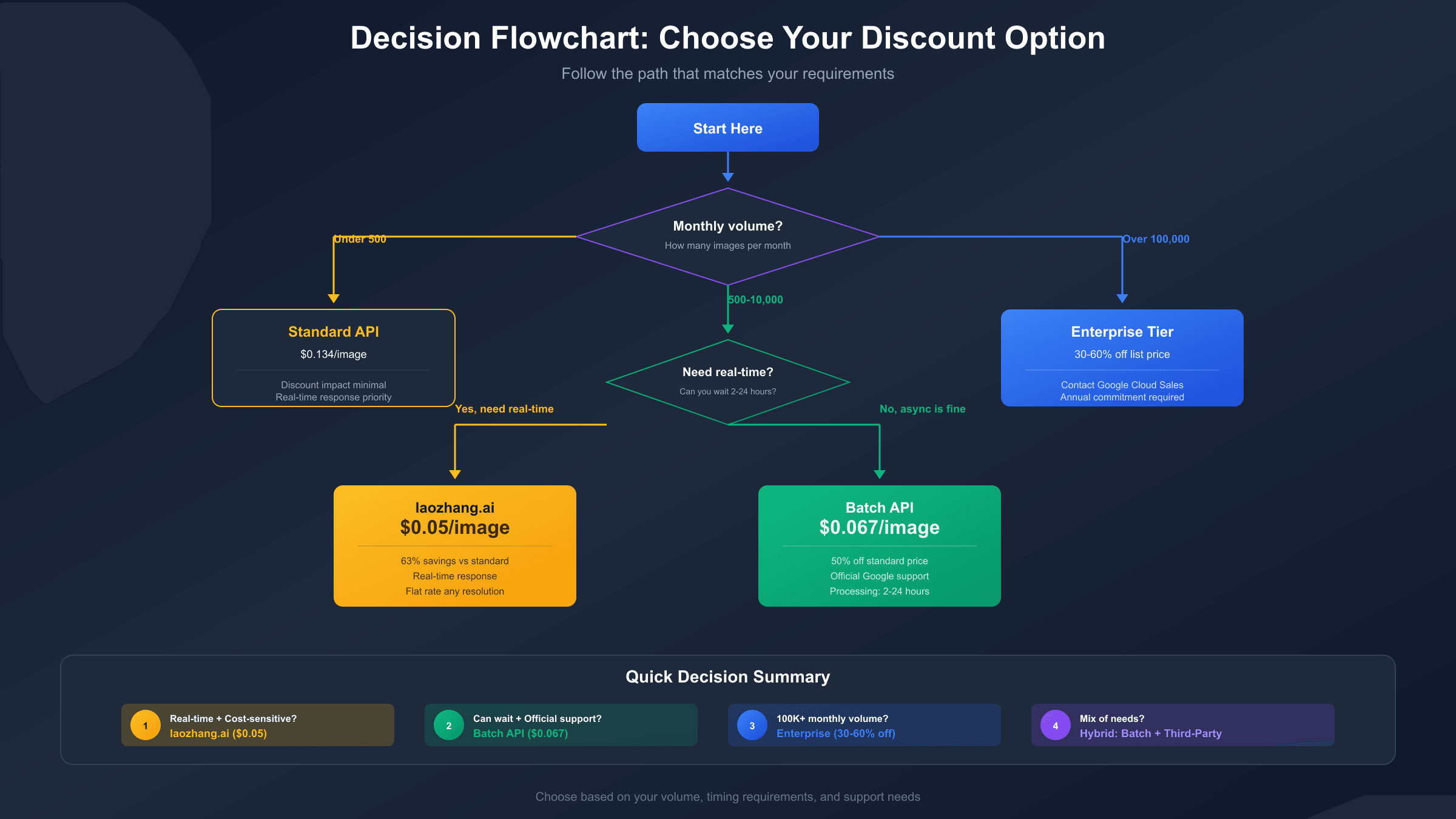 For most users, the decision comes down to timing requirements. If batch processing's 2-24 hour delivery window fits your workflow, the official 50% discount represents the simplest optimization with full Google support. If real-time responses are essential but cost matters, third-party access through laozhang.ai at $0.05 per image delivers competitive pricing without the batch processing trade-off. For enterprise-scale operations exceeding $25K monthly, direct engagement with Google Cloud sales can unlock the deepest discounts—potentially approaching $0.03-0.04 per image with combined enterprise and batch pricing.