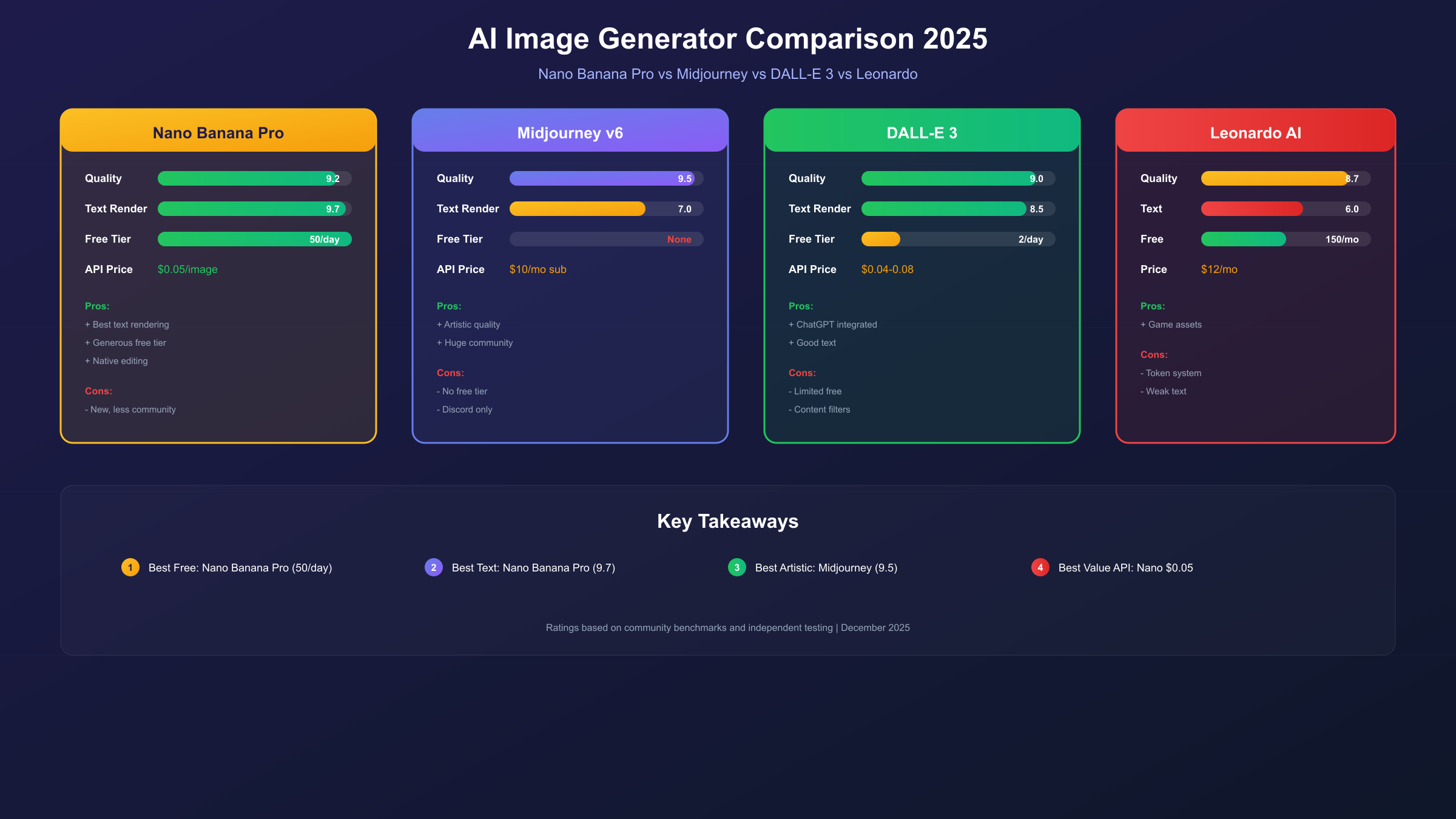 Leonardo offers generous free credits and strong results for gaming and concept art. Nano Banana Pro surpasses Leonardo in photorealism and text accuracy but Leonardo provides more granular control over specific parameters and better LoRA/style model support. For specialized workflows, Leonardo's flexibility remains valuable.