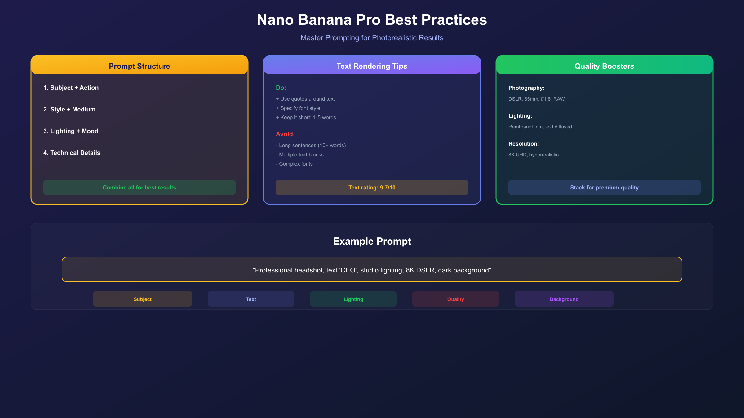 After generating thousands of images with Nano Banana Pro, certain patterns consistently produce superior results. Here are the techniques that matter most.
