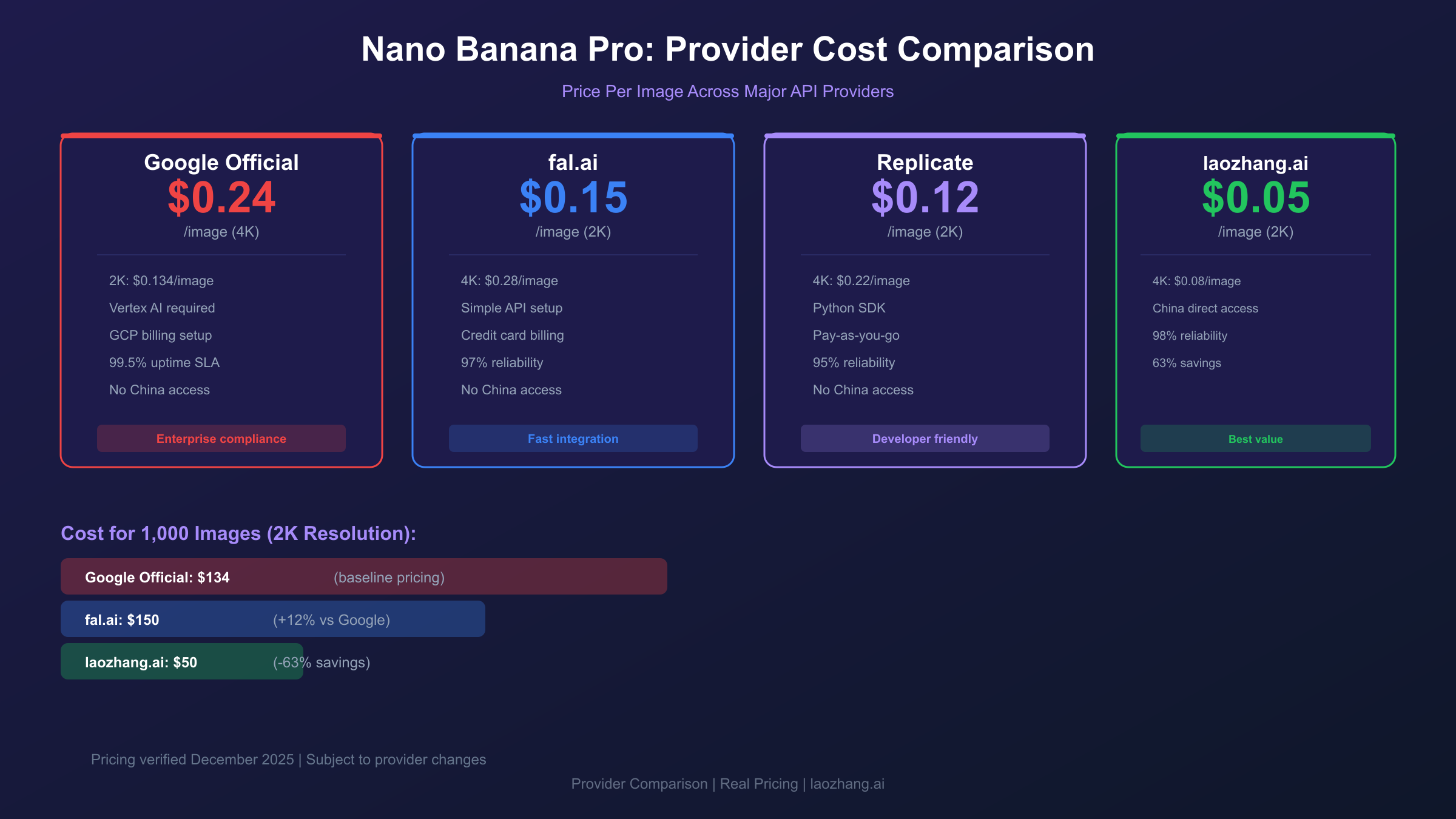 For developers in mainland China, laozhang.ai's Nano Banana Pro service offers a compelling option at $0.05 per image—representing 63% savings versus Google's effective pricing. The service includes direct China connectivity without VPN requirements. For a comprehensive guide to accessing Nano Banana Pro from China, see our Nano Banana Pro China Access Guide.