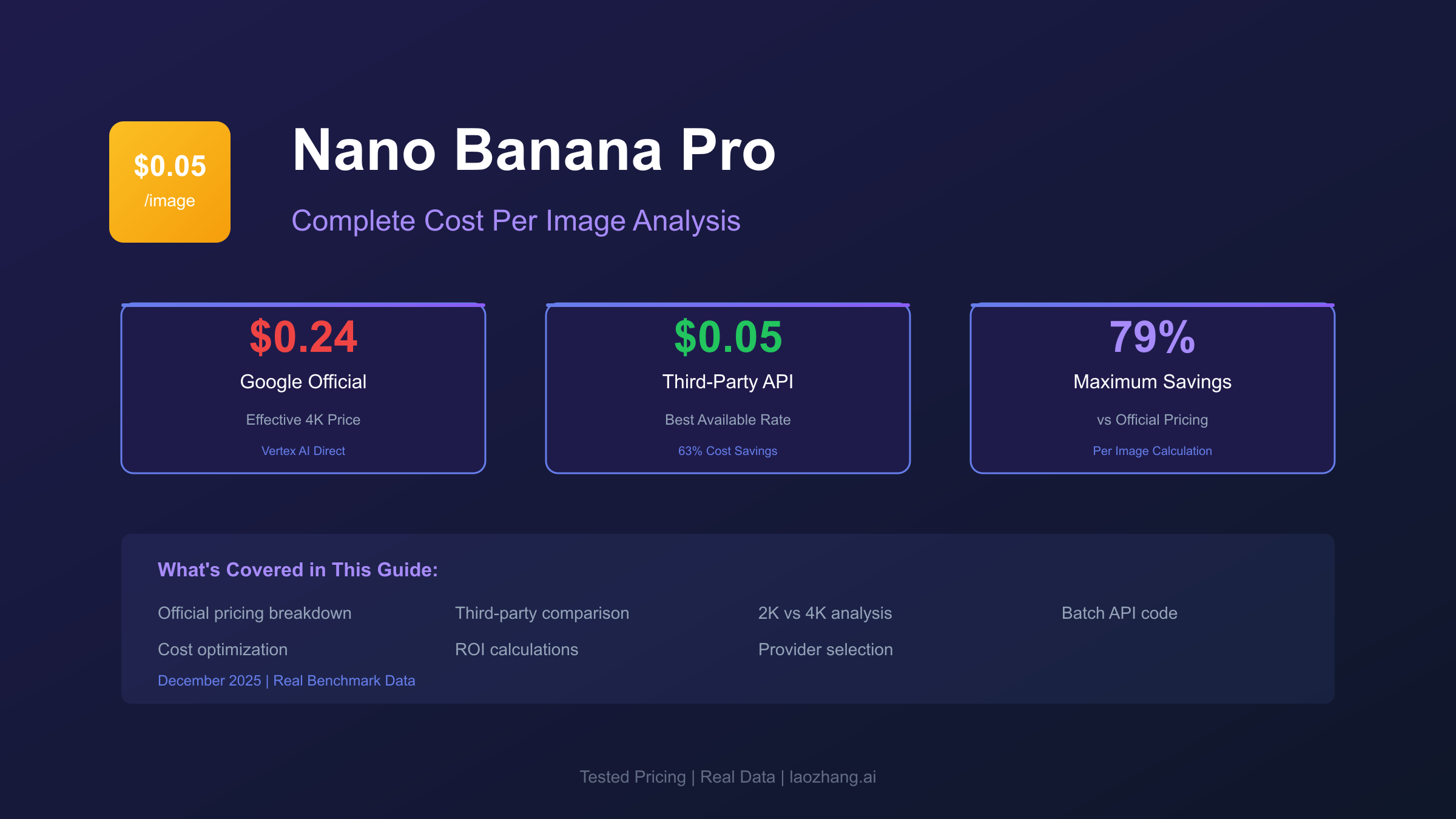 The minimum verified cost is $0.05 per image through third-party providers like laozhang.ai, representing 63% savings versus Google's effective pricing of $0.134/image for 2K resolution.