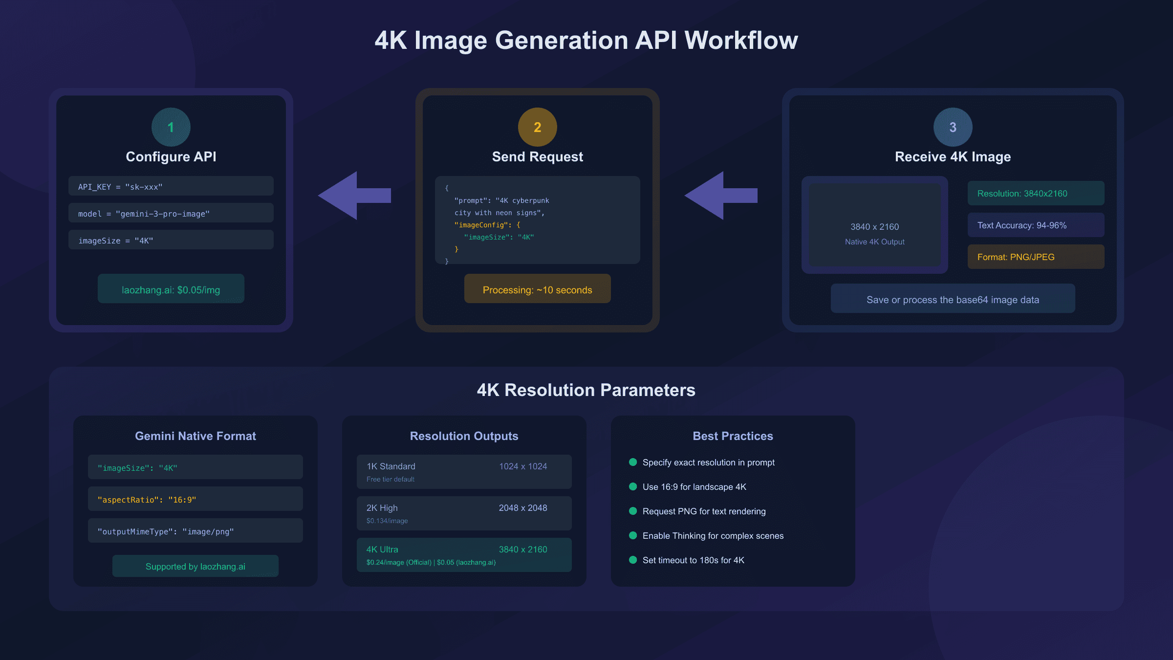 4K output requires paid API access with specific configuration. Free tier access typically caps at 1K resolution. When using the API, specify "4K" in the imageConfig or output_resolution parameter.