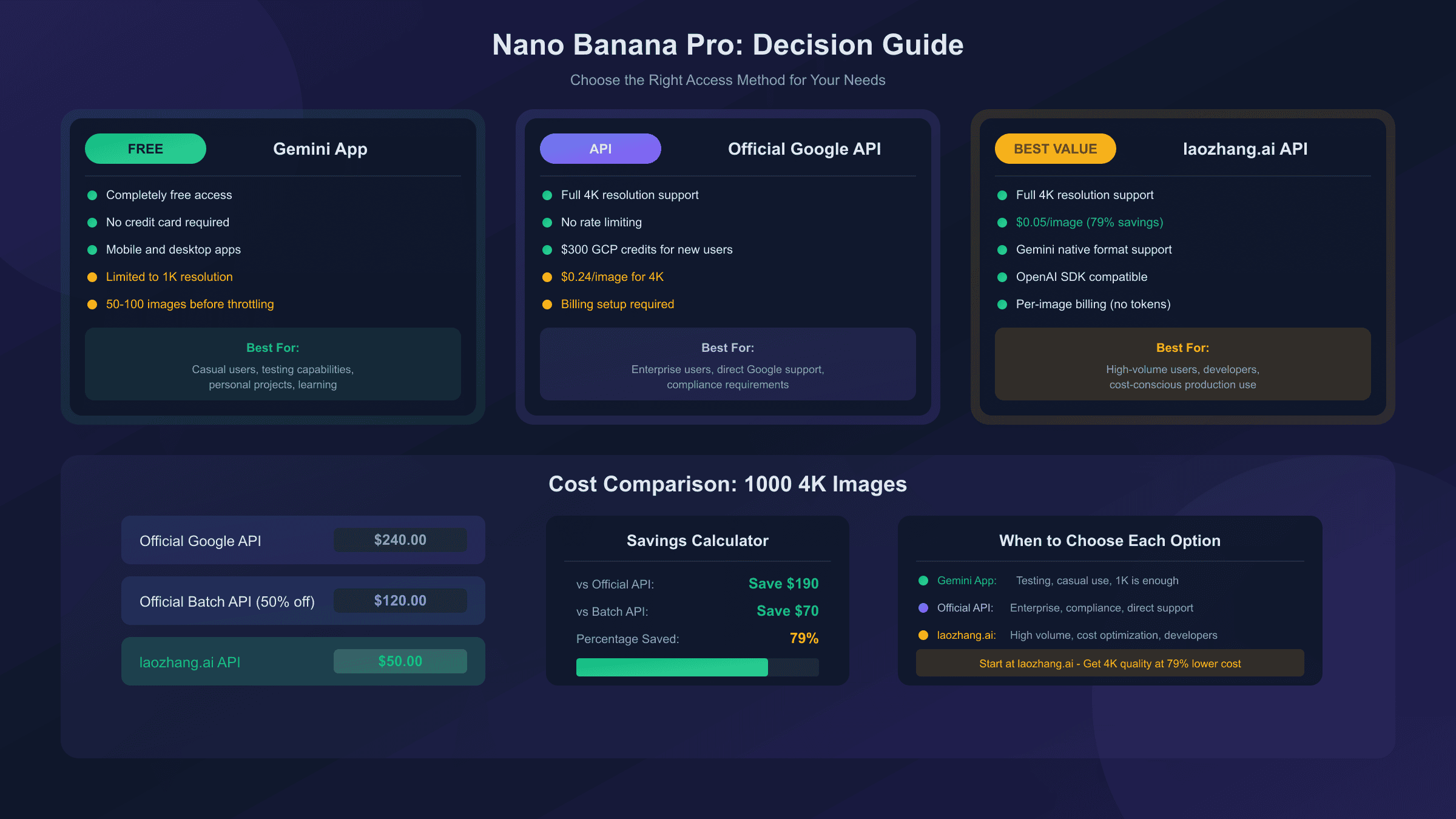 For developers seeking reliable access to Nano Banana Pro's commercial capabilities without the complexity of direct Google API integration, services like laozhang.ai provide stable, cost-effective endpoints suitable for production deployment. The per-image pricing model simplifies budgeting for projects with defined scope, while high concurrency support handles batch processing requirements.
