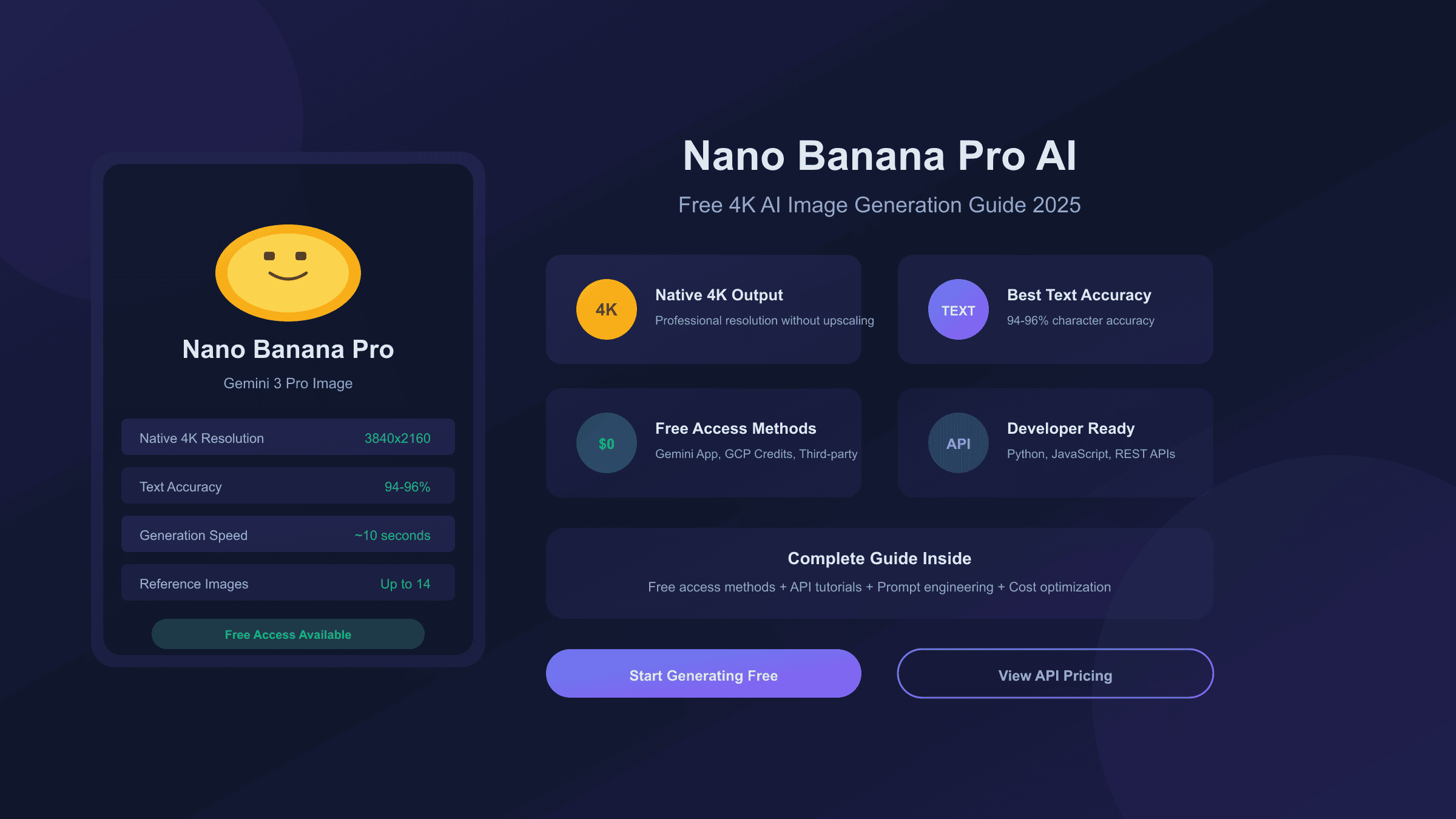 Master Nano Banana Pro (Gemini 3 Pro Image) for stunning 4K AI image generation. Learn free access methods, API integration, prompt engineering tips, and cost-effective alternatives for professional-quality AI art.