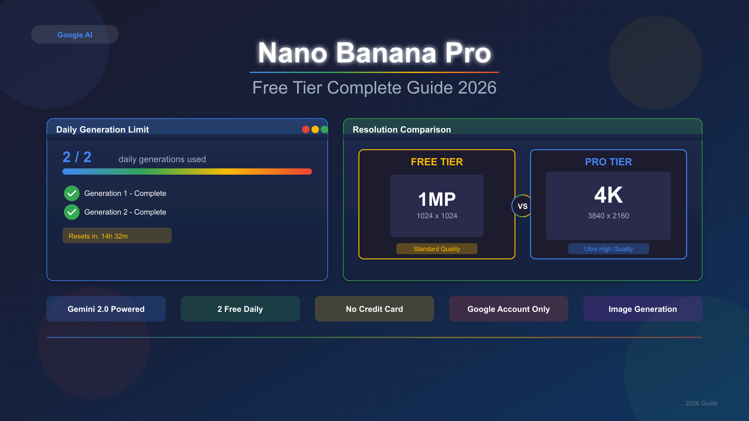 Nano Banana Pro free tier offers 2 daily image generations at 1 megapixel resolution through the Gemini app. All outputs include a visible watermark. Reset occurs at midnight Pacific Time (8:00 AM GMT). When quota exhausts, the system silently switches to the older Nano Banana 2.5 Flash model.