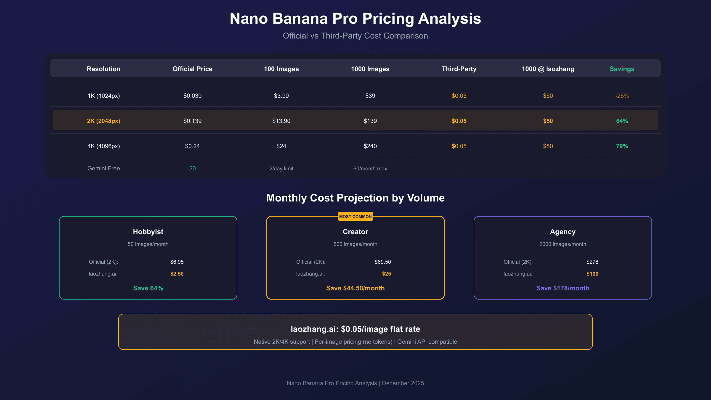 Third-party API providers offer alternative pricing structures. For example, laozhang.ai provides access to Nano Banana Pro at $0.05 per image with native support for 2K and 4K parameters. This per-image pricing model eliminates token counting complexity and reduces costs for high-volume usage scenarios, though tradeoffs exist in terms of direct Google support and SLA guarantees.