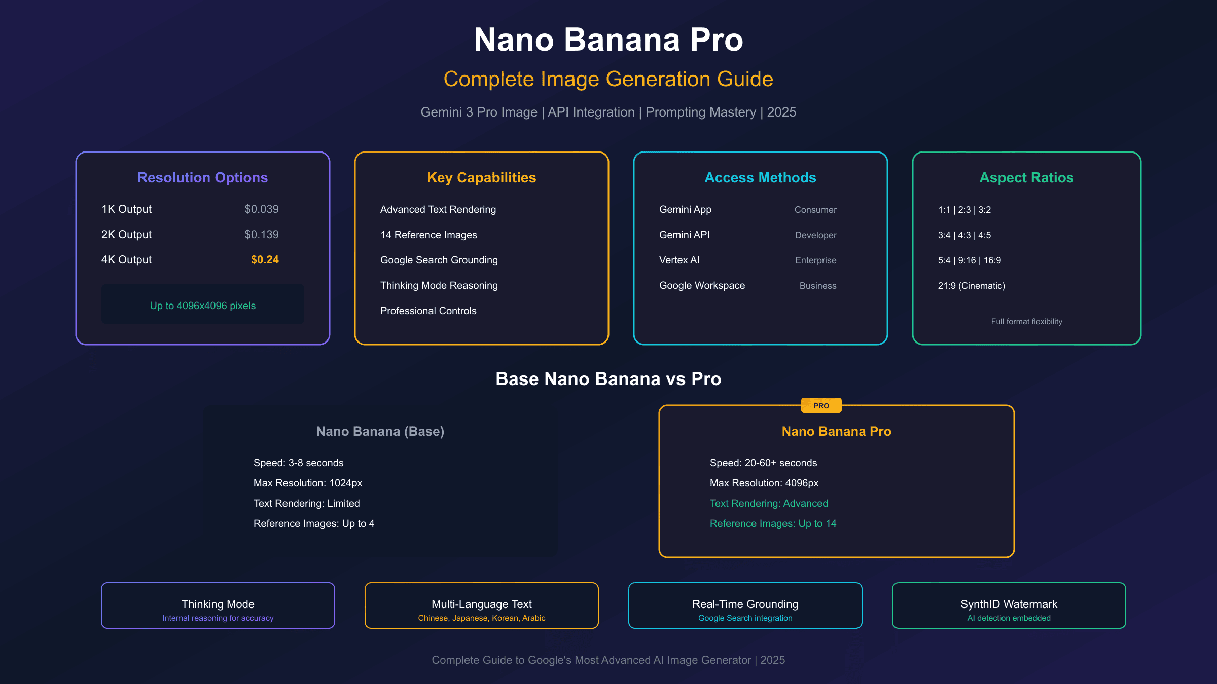 Key Specifications: 4K output ($0.24/image) | 2K output ($0.139/image) | Up to 14 reference images | Advanced text rendering | Google Search grounding