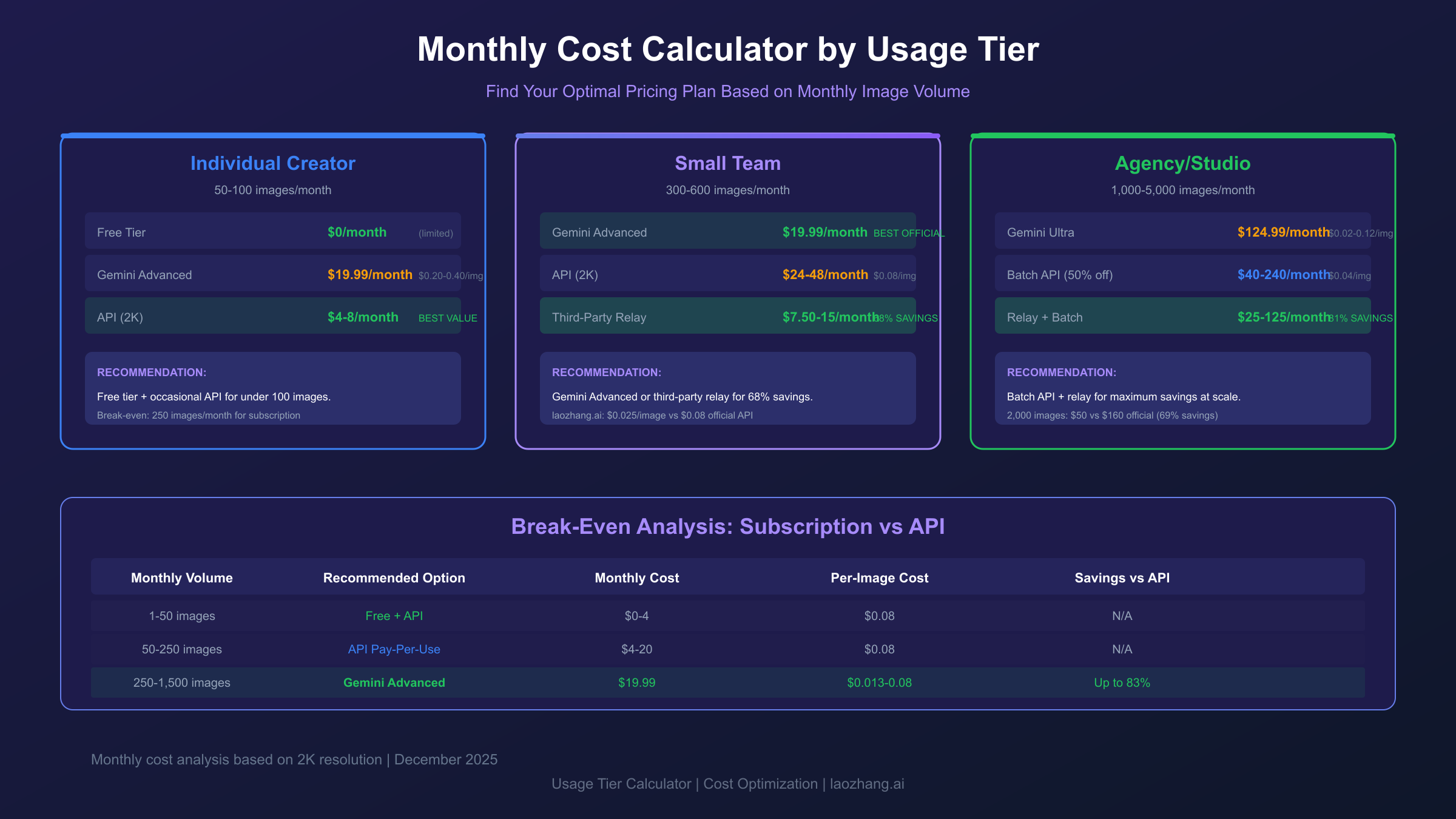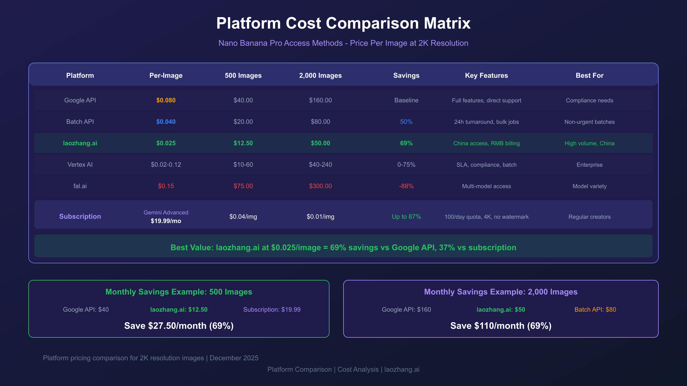 Recommendation: At this volume, Gemini Advanced provides the best value among official options. However, third-party platforms like laozhang.ai offer significantly lower costs at $0.025/image—a potential savings of 68% compared to API pricing.