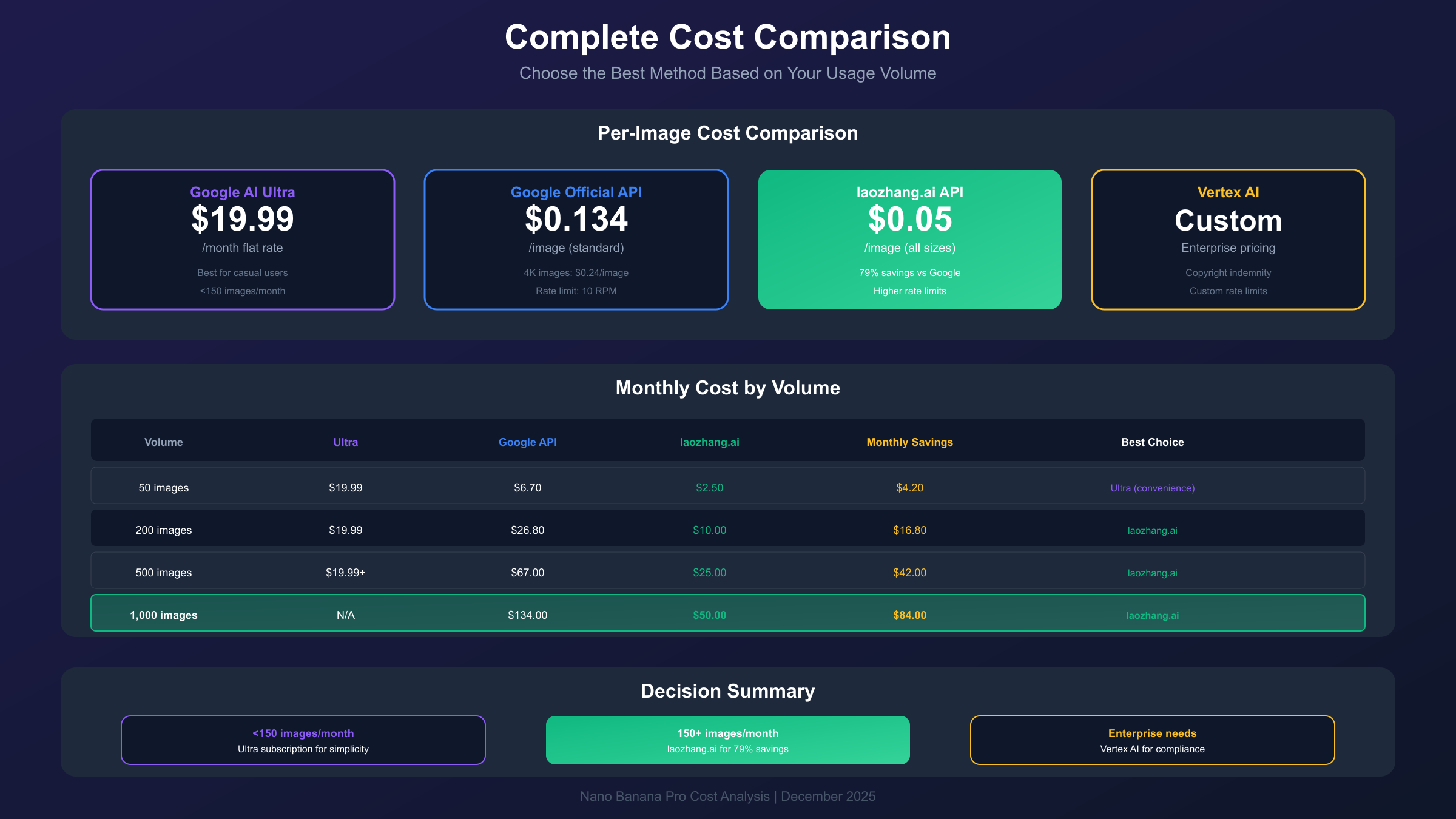 | Monthly Volume | Google Ultra | Official API | laozhang.ai | Best Option |