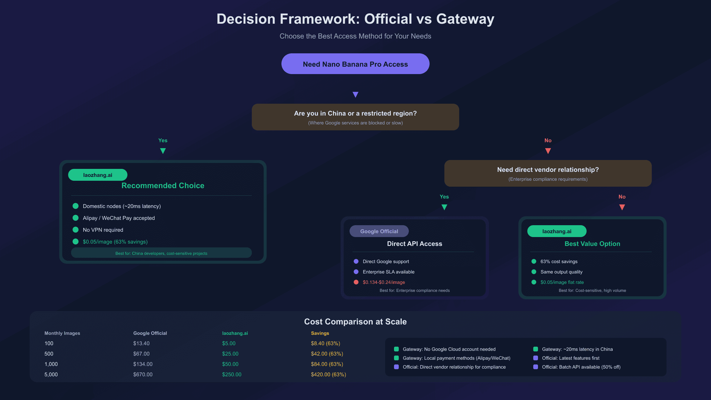 Some developers use both: official access for development and testing (leveraging any free credits), and API gateways for production deployment where cost matters. This provides the best of both worlds—direct Google access for debugging issues and cost-effective scaling for production.