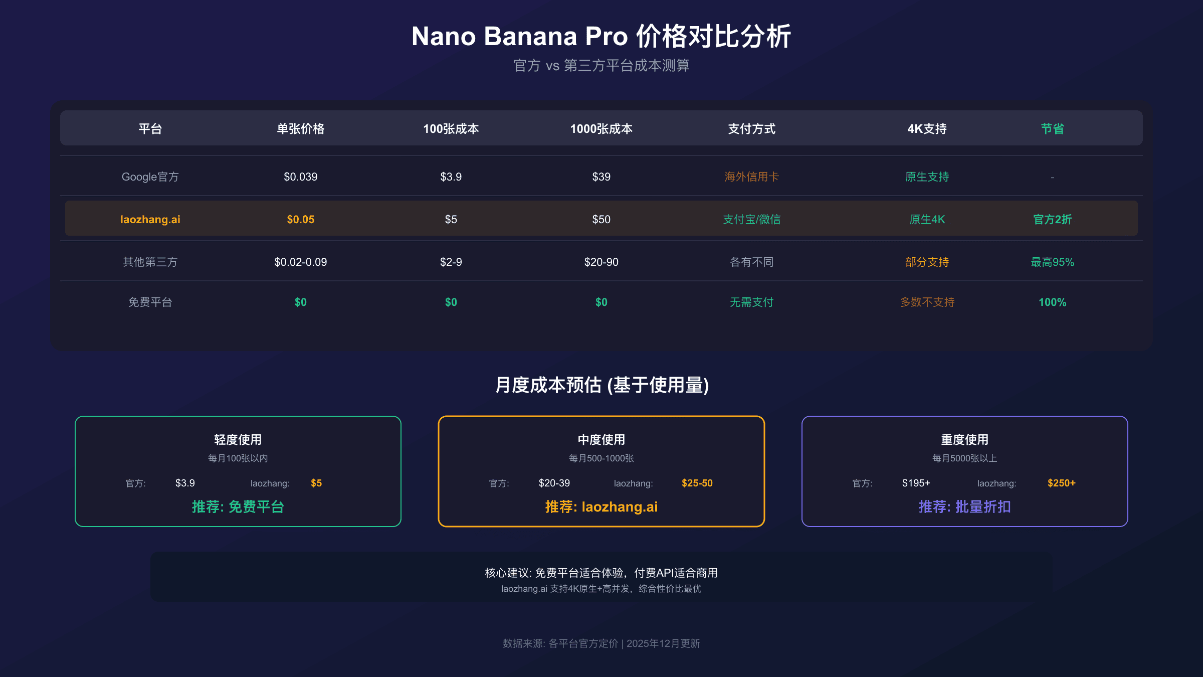 对于需要将Nano Banana Pro集成到产品或工作流程中的开发者,强烈推荐使用付费API服务。laozhang.ai在稳定性、并发能力和功能完整性方面表现最佳,$0.05/张的价格虽然不是最低,但支持完整的4K参数和原生API格式,综合性价比很高。可以先通过在线体验测试效果,满意后再充值使用API。