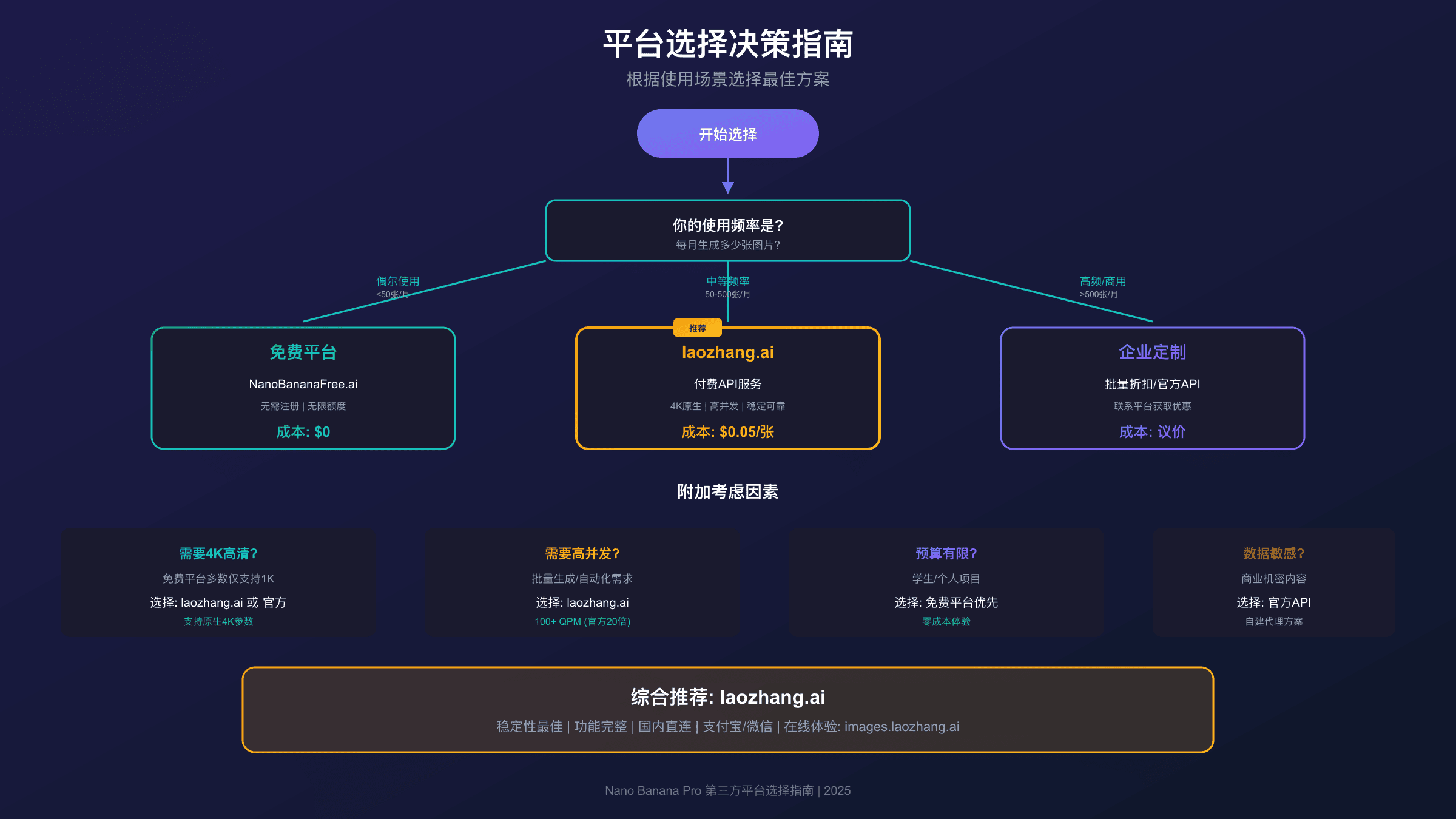 从表格可以看出,如果你的使用量较小(每月100张以内),免费平台完全够用。但如果是商业用途或频繁使用,付费API服务在稳定性和功能完整性上更有保障。以生成1000张图片为例,官方API成本约$39,而通过laozhang.ai仅需$50,虽然单价略高于部分平台,但采用按次计费模式,不消耗token额度,成本完全可预测,且支持原生4K参数,性价比更高。