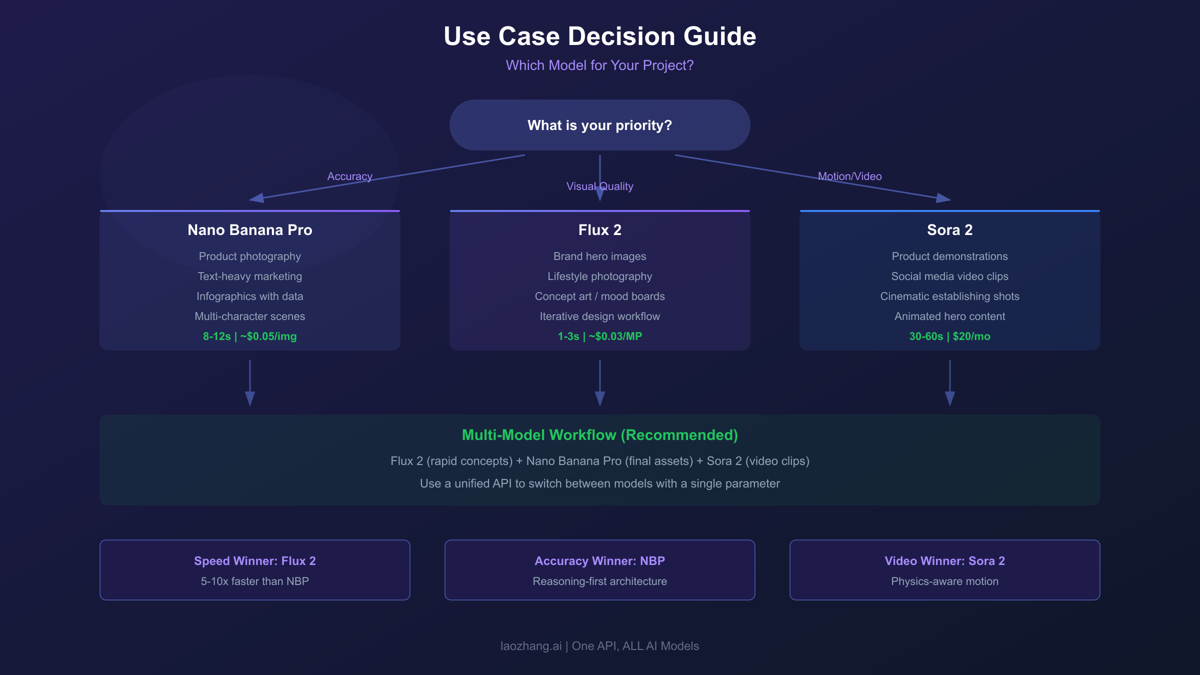 Where Sora 2 genuinely competes is in the conceptual space of "visual content generation." A marketing team deciding between a static hero image (Nano Banana Pro or Flux 2) and a short video loop (Sora 2) for a landing page is making a format decision, not just a model decision. Sora 2's ability to generate video from a single image means you can create a still with Nano Banana Pro, then animate it with Sora 2—a workflow that combines the strengths of both. For more on this topic, see our Nano Banana Pro vs Sora 2 detailed comparison.