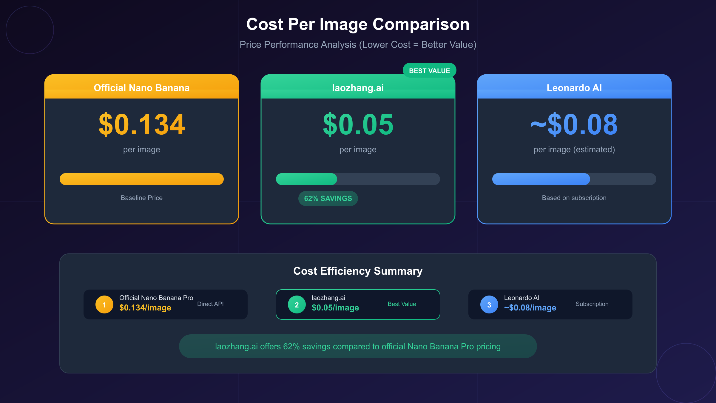 Cost-conscious users should evaluate third-party providers for Nano Banana Pro access. Services like laozhang.ai offer the same model quality at approximately $0.05 per image—combining Nano Banana Pro's quality and consistency advantages with pricing competitive with or below Leonardo AI. This option particularly benefits users in regions where direct Google API access faces connectivity challenges.