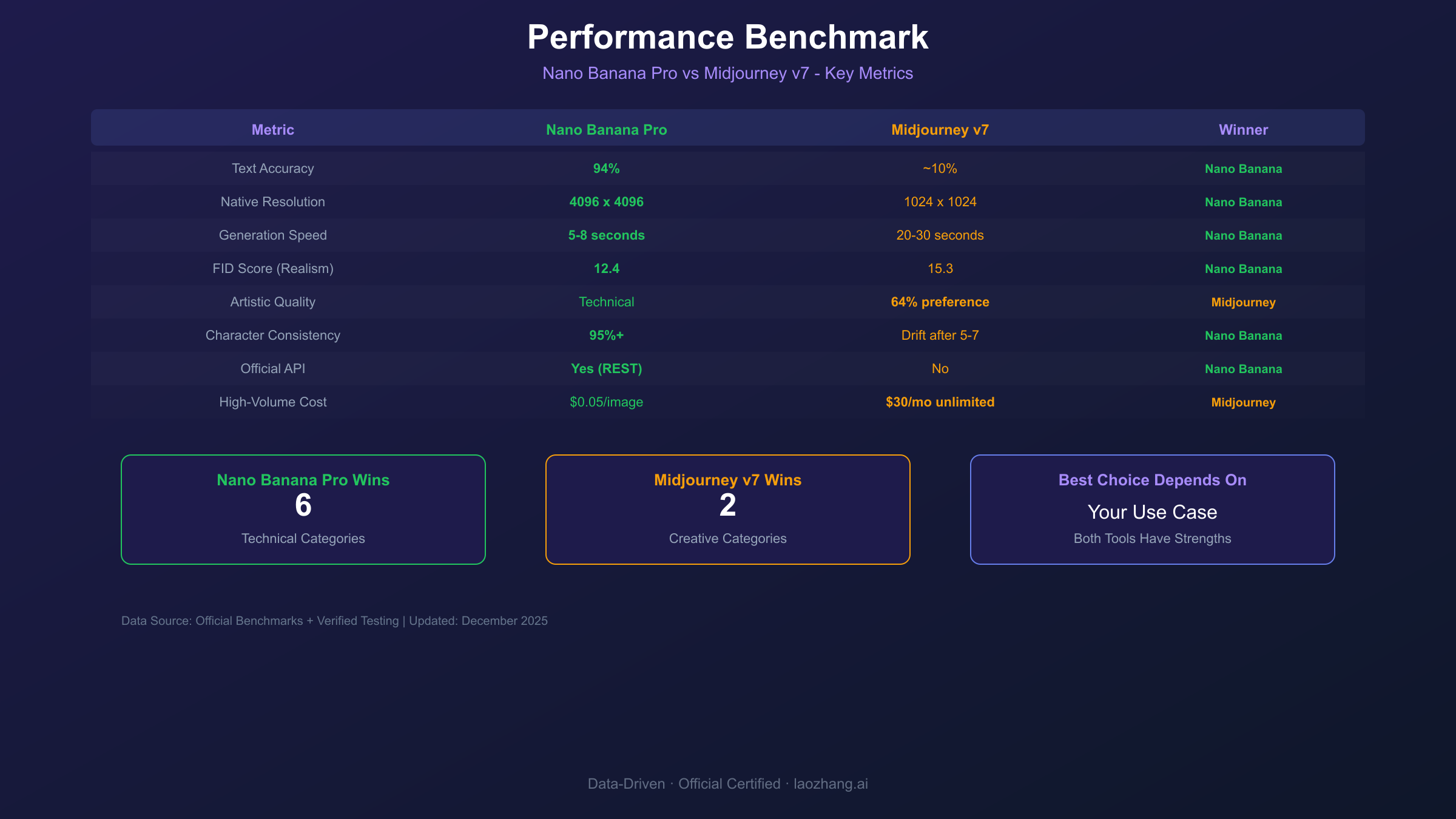 Compare Nano Banana Pro and Midjourney v7 with real benchmark data: 94% vs 10% text accuracy, 4K native vs 1024px, $0.05 vs $30/month. Complete guide with API examples and decision framework.