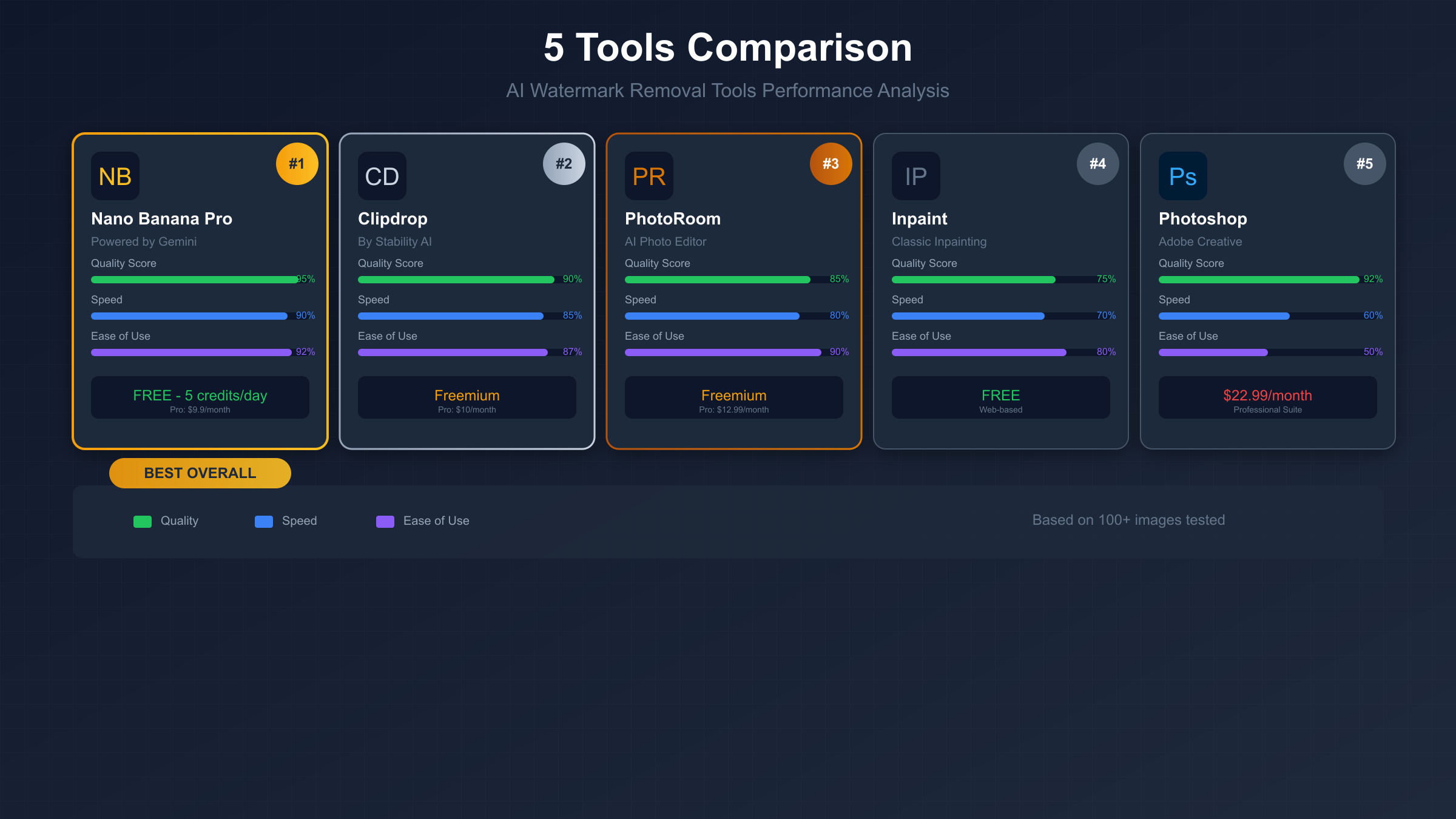 对于已经有带水印图片的用户,使用专门的去水印工具是一个选择。我们实测了5款市面上流行的Nano Banana Pro去水印工具,从技术原理、效果、成本等维度进行对比。