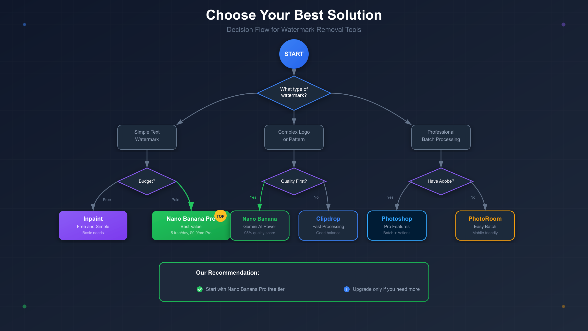 Nano Banana Pro的水印系统分为可见水印和隐形SynthID两部分。对于绝大多数用户来说,只需要处理可见水印问题即可正常使用。最推荐的方案是使用第三方API服务($0.03-0.08/张)从源头获取无水印图片,这比事后去水印更高效也更经济。