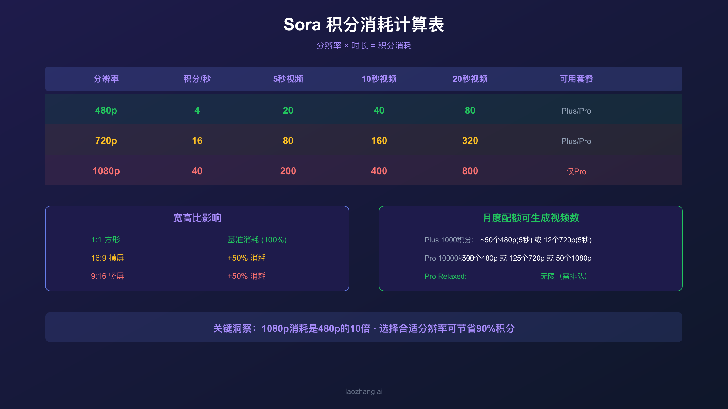 举个实际例子:如果你要生成一个10秒的720p横屏(16:9)视频,计算方式是:16积分/秒 × 10秒 × 1.5(宽高比系数) = 240积分。对于Plus用户的1,000积分月配额来说,这意味着每月最多能生成4个这样的视频。