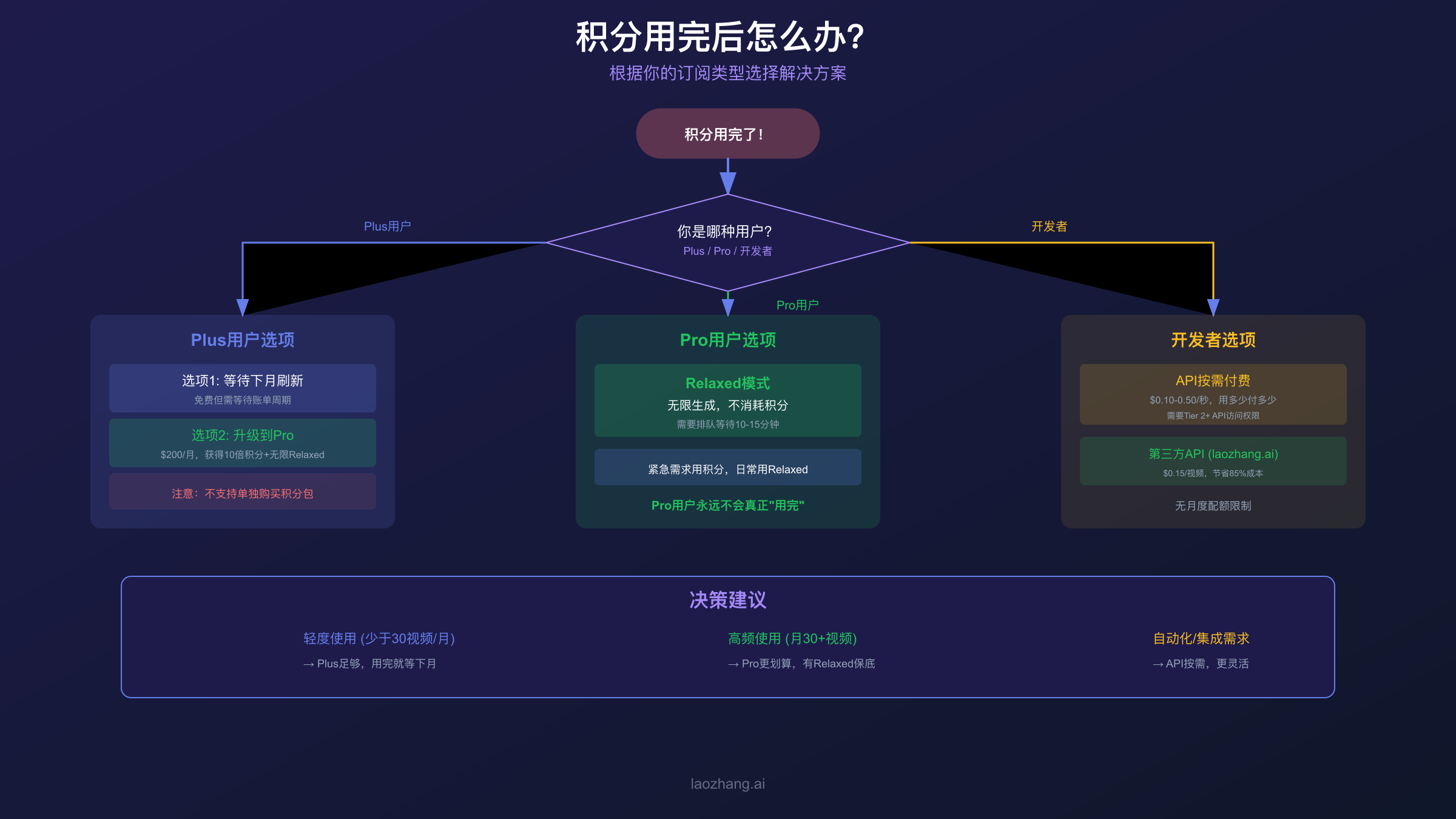开发者的选择: 如果你是开发者或有自动化集成需求,可以考虑API按需付费模式。官方API按$0.10-0.50/秒计费,无月度配额限制。对于不想承担$200/月订阅费但需要灵活调用的场景,第三方API服务如laozhang.ai提供更具性价比的选择,单个视频仅$0.15。