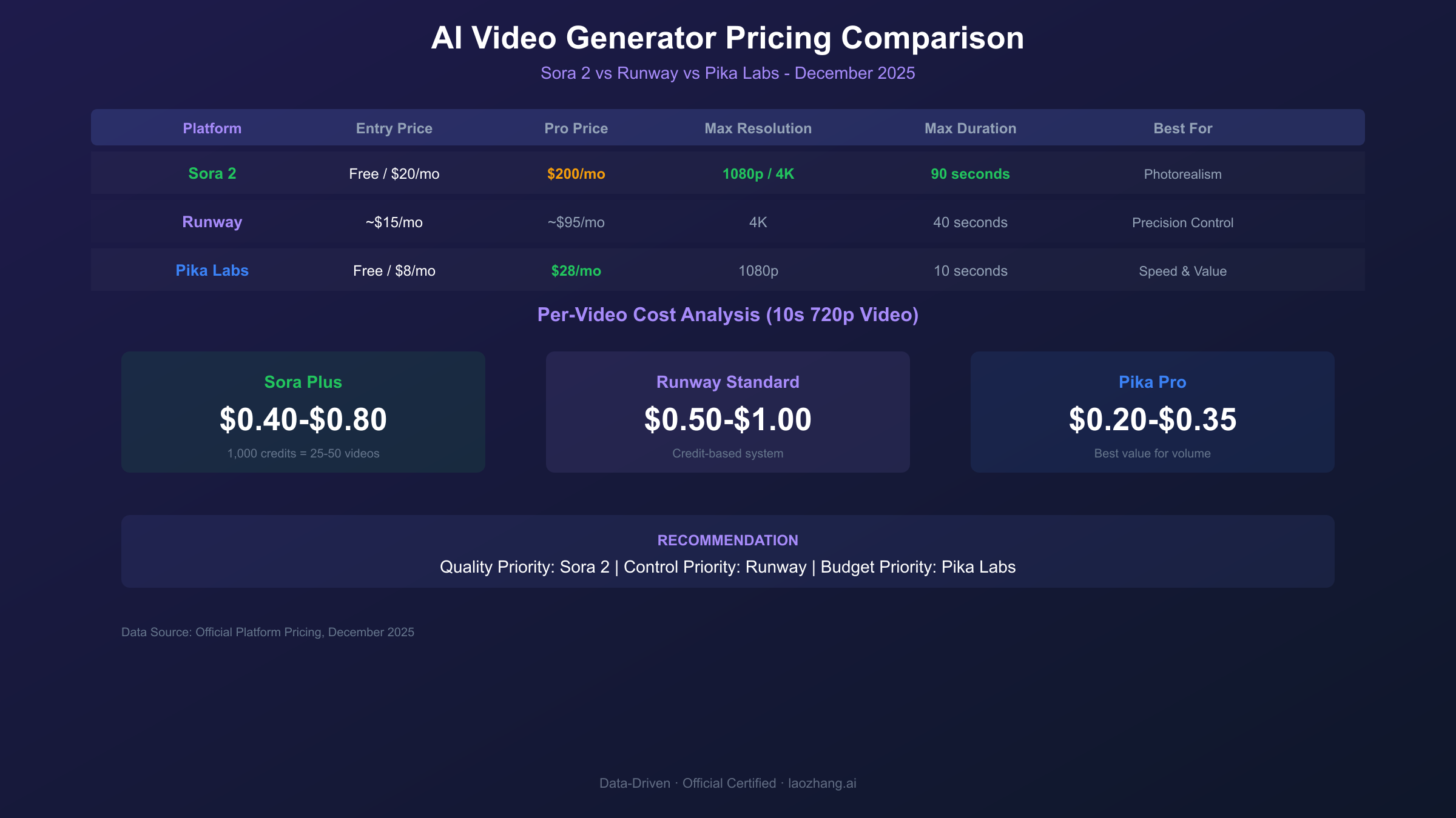 Pricing and specifications current as of publication date. OpenAI frequently adjusts Sora features and limits—verify current terms through official documentation before purchasing.