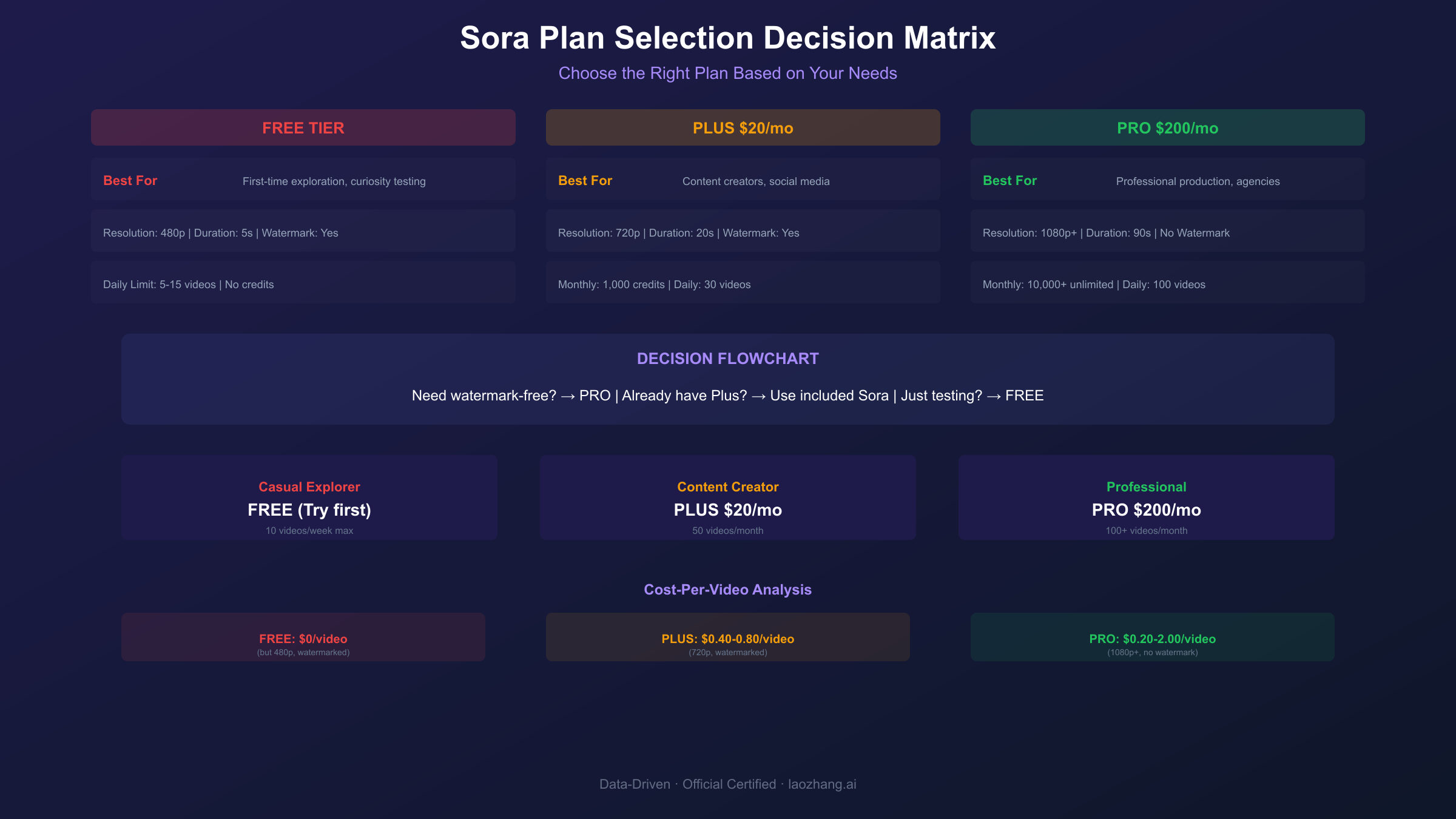 Compare Sora 2 free tier, ChatGPT Plus ($20/mo), and Pro ($200/mo) plans. Learn credit systems, resolution limits, daily caps, and which plan offers the best value for AI video generation.