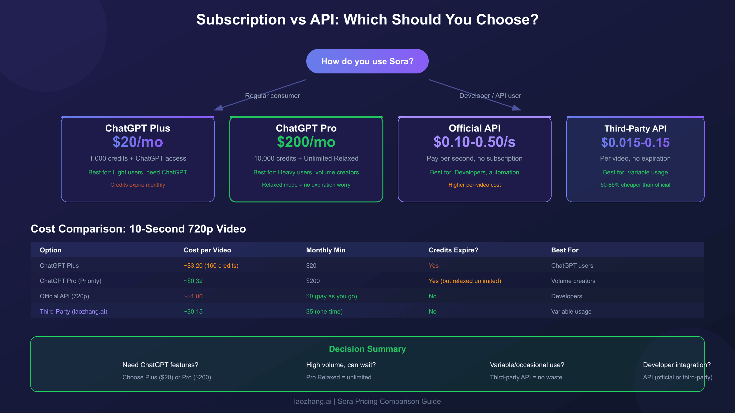 If you need ChatGPT's conversational features alongside Sora, subscription makes sense. If you only need video generation and want maximum flexibility, API access through third-party providers offers better economics for irregular usage patterns. For more details on API pricing structures, see our Sora 2 API pricing comparison.