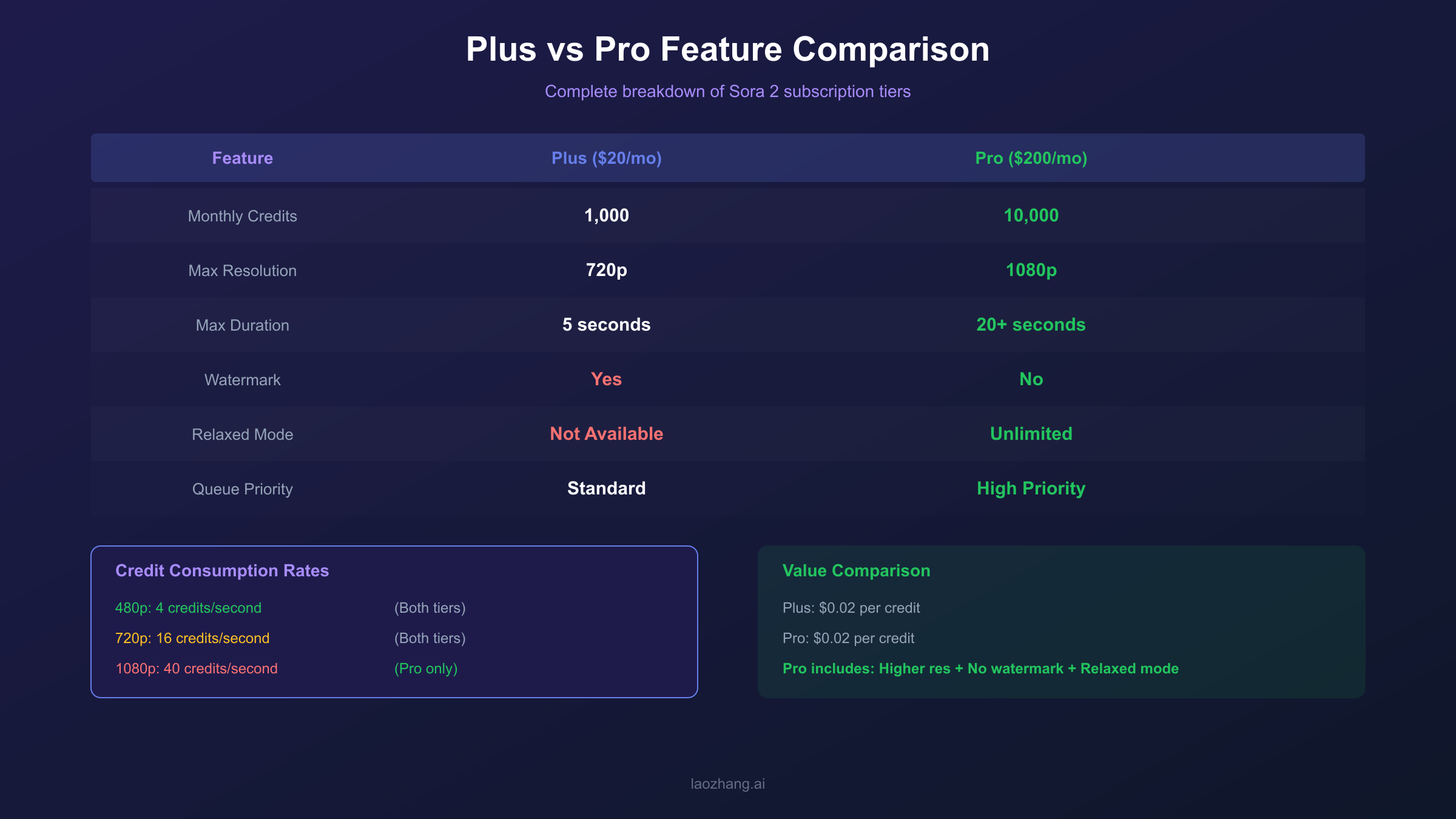 Sora 2 offers two subscription tiers: Plus at $20/month with 1,000 credits and 720p output, and Pro at $200/month with 10,000 credits, 1080p resolution, and unlimited relaxed mode.
