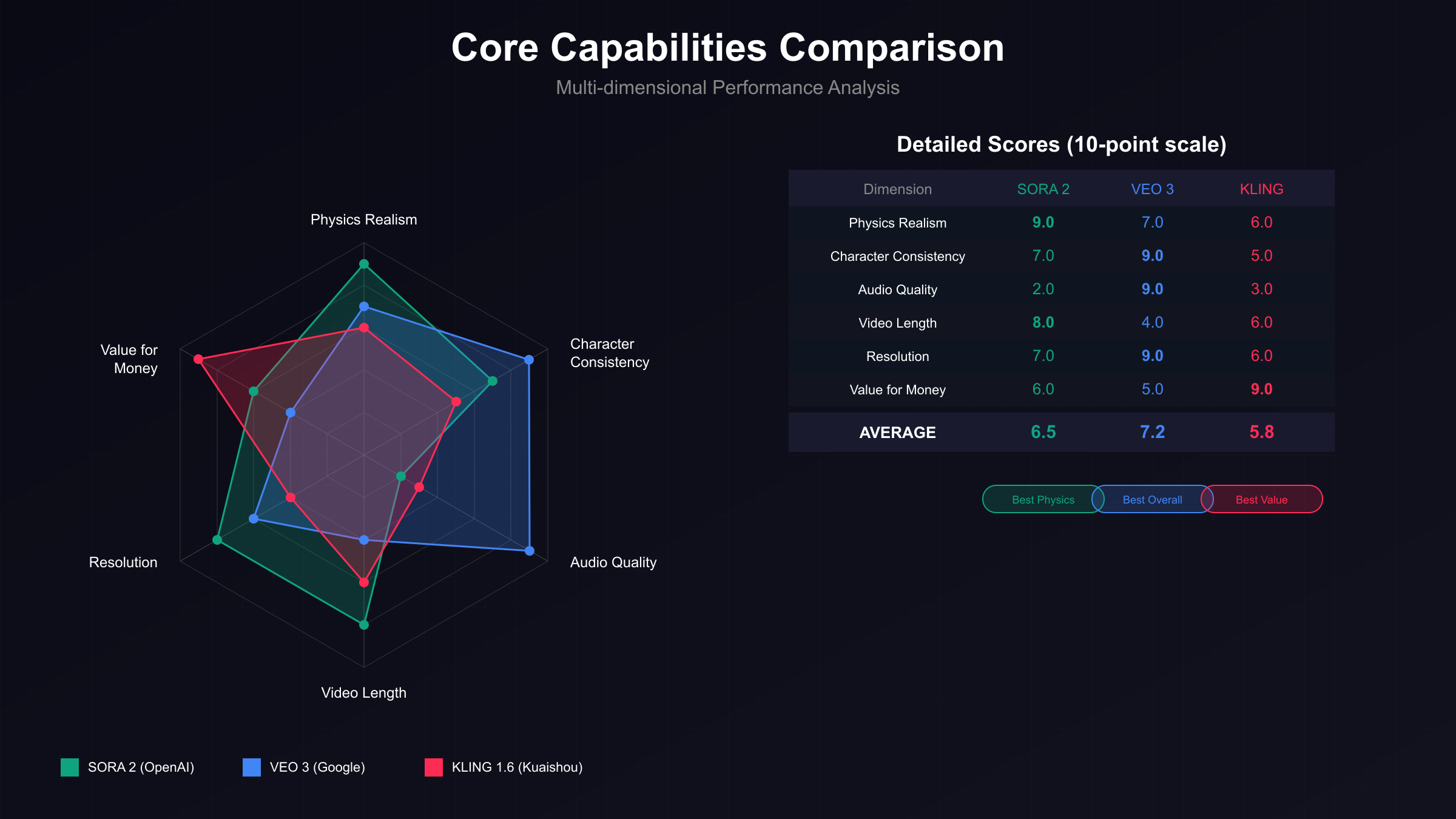 | Dimension | Sora 2 | Veo 3.1 | Kling 2.6 |