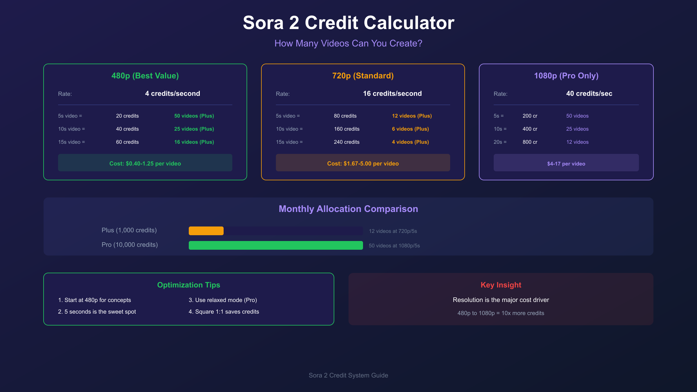 For most use cases, 720p at 5 seconds offers the optimal balance. This configuration costs ~$1.67 per video on Plus (13 videos/month) while maintaining sufficient quality for social media and presentations.