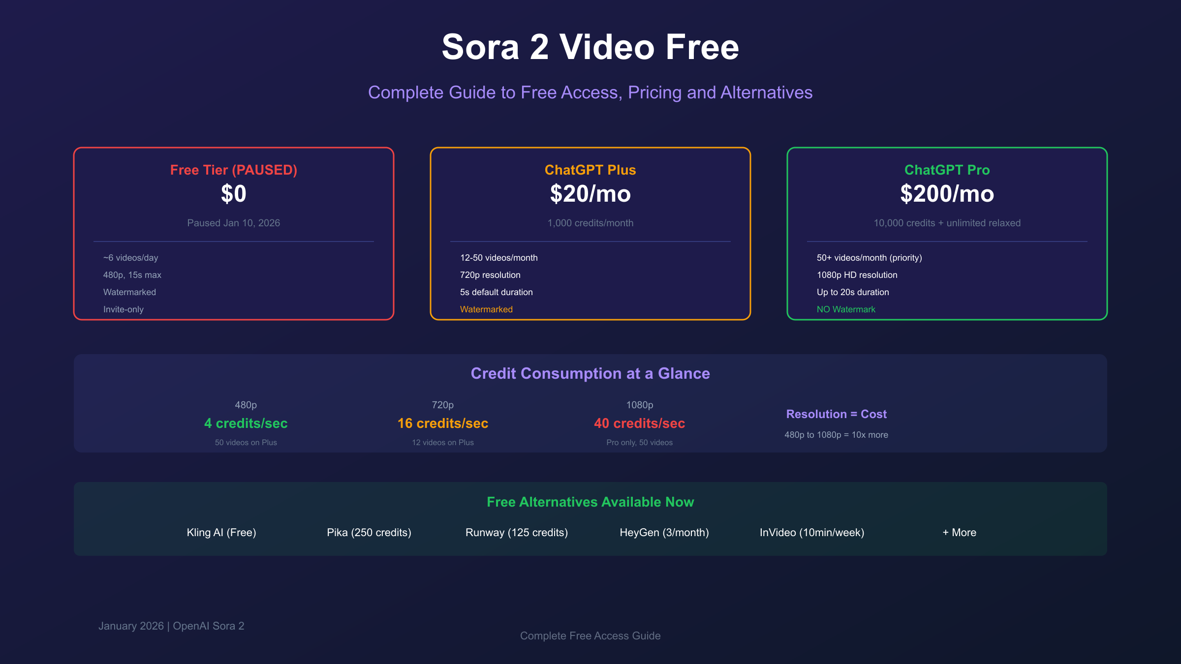 Is Sora 2 video generation free? Learn about the paused free tier, Plus/Pro pricing, credit system calculator, and 10 free alternatives. Updated January 2026.
