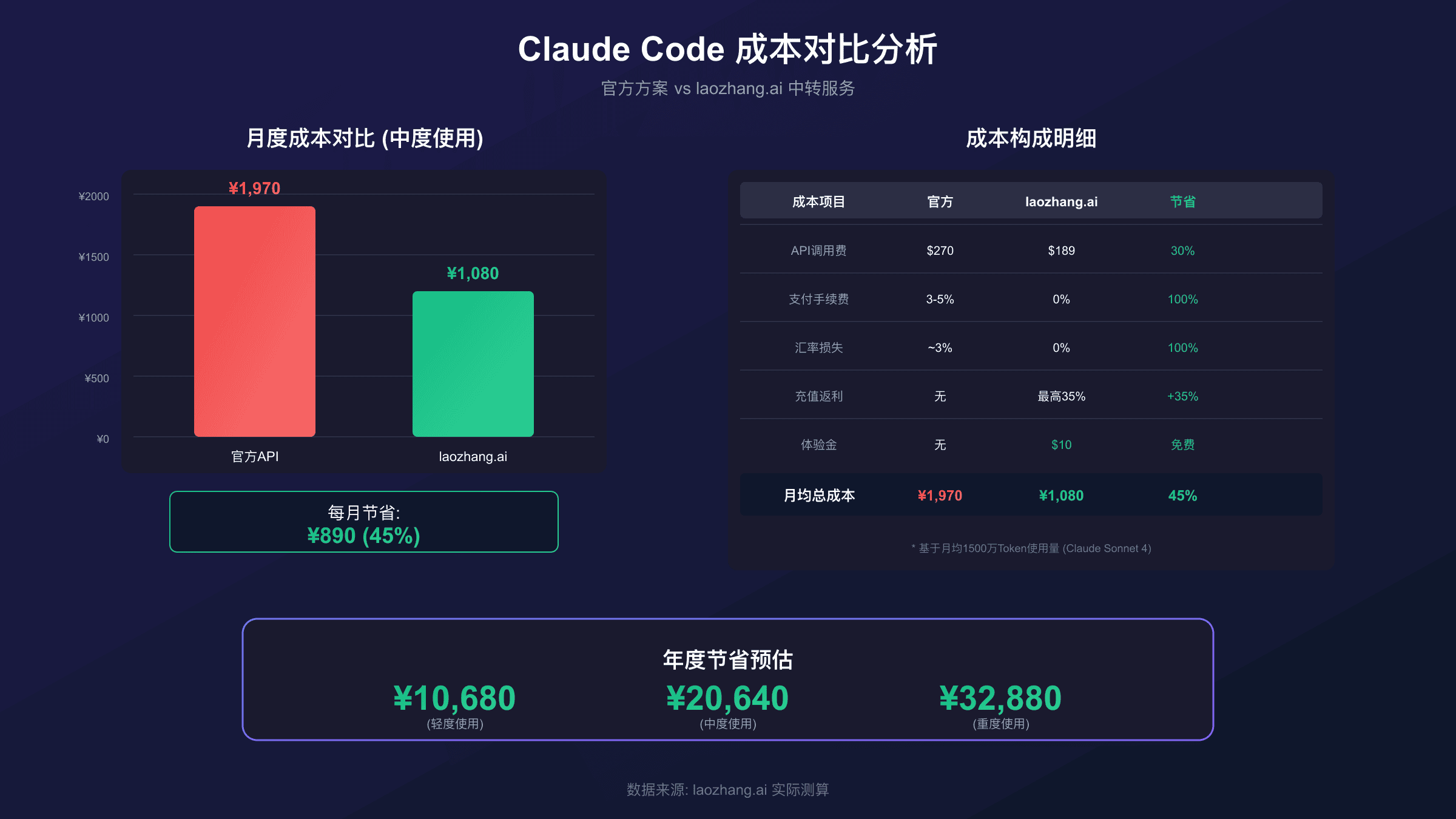 | 成本项目 | 官方方案 | laozhang.ai | 节省比例 |